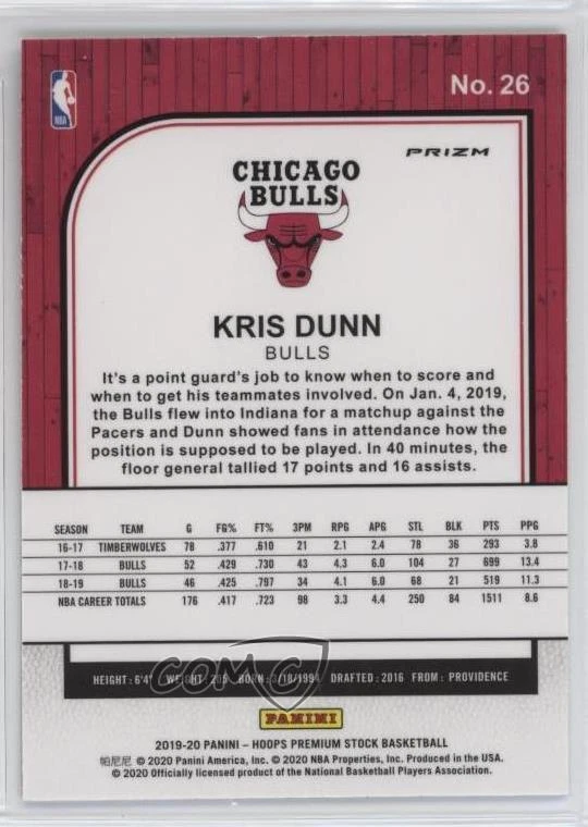 2019-20 Panini NBA Hoops Premium Stock - [Base] - Box Set Pulsar Prizm #26 Kris Dunn - Basketball Card - Featuring the Chicago Bulls - Featuring Kris Dunn Search for more: 2019-20 Panini NBA Hoops Premium Stock Search for more: 2019-20 Panini NBA Hoops Premium Stock - [Base] - Box Set Pulsar Prizm View all of our Listings Auctions Buy It Now About Us Located in the beautiful Pacific Northwest, COMC (Check Out My Cards) is the world's largest consignment service for trading card singles. More than 10,000 people have used our consignment service to list over 50 million trading cards. We currently house 20 million cards, each listed for sale with front and back images of the actual card. Find out how we can help you consign your items on eBay by contacting us through eBay messaging. COMC -- "The Safe & Easy Way to Buy & Sell" Representative Image - Select Specific Item above to see image of actual item Representative Image - Select Specific Item above to see image of actual item Raw Condition for Modern Cards Unless otherwise noted, raw modern cards are listed in Near Mint-Mint condition or better. A NM-MT card appears to be Mint at first glance, but upon closer inspection, may exhibit some of the following: minor print defects (e.g. roller marks, print line, dimple), minor scratches, slight edge wear, and slight corner wear. Centering is clearly visible in the images provided and does not factor into our condition assessment. Raw Condition for Vintage Cards Unless otherwise noted, raw vintage cards are listed in Excellent condition or better. An EX card may exhibit some of the following: minor rounding of corners, surface wear, print defects, light scratches, and slight edge wear/chipping. Centering is clearly visible in the images provided and does not factor into our condition assessment. Domestic Shipping Combined shipping for multiple items is available. To receive combined shipping, please ensure all desired items are in your eBay shopping cart before proceeding to checkout. eBay limits orders to 40 items per order. We automatically combine multiple orders placed on the same day. If you place multiple orders on the same day, please contact us to request a refund of applicable shipping costs. Signature confirmation may be required on invoices over $400. Raw cards are shipped in toploaders. International Shipping COMC offers eBay's International Shipping (EIS) for international orders under $2,500* (see country exceptions below). All duties and import fees are paid at checkout; in the rare event that there are additional import fees upon delivery, these are borne by the buyer. EIS packages route through a shipping hub in Erlanger, KY before shipping to their final destination. Please note that EIS does not allow for combined shipments. The shipping rates are determined by eBay and cannot be adjusted. *Maximum sale price exceptions: Colombia, Kuwait ($2,000); Taiwan ($1,539); Chile, Costa Rica, Guatemala, Honduras, Trinidad and Tobago ($1,000); Antigua and Barbuda, Aruba, Belize, Dominica, Grenada, Philippines, Saint Kitts and Nevis, Saint Lucia, Montserrat, Turks and Caicos Islands ($500); Dominican Republic, El Salvador ($200). Please request a shipping quote through eBay messaging for orders that exceed the maximum sale price supported by eBay's International Shipping. You will be responsible for all duties and import fees for international orders shipped outside the EIS. Raw cards are shipped in toploaders. Payment COMC does not accept offers on our cards through our eBay storefront. COMC utilizes eBay’s managed payments system. If you are experiencing difficulties making a payment, please contact eBay for assistance. Return Policy Returns are only accepted on the rare occasion the item is not as described. If you are making a return, please initiate the return process through eBay so a mailing label can be provided for you. Prior to listing, our expert team carefully assessed this item to represent it accurately. Please review the description and high-definition images prior to purchasing to ensure this item meets your satisfaction. We welcome you to contact us if you have further questions about this item. Trust and Integrity COMC carefully assesses each item consigned to us to prevent fraudulent items from entering the marketplace. If you believe an item offered on COMC may be fraudulent, please contact us with details so we can investigate the issue. Items we determine are outside our supported items policy may be removed. Last Modified: 1/17/2025 1:58:26 AM PDT
