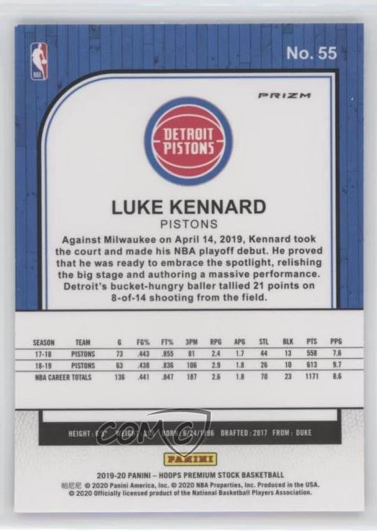 2019-20 Panini NBA Hoops Premium Stock - [Base] - Box Set Pulsar Prizm #55 Luke Kennard - Basketball Card - Featuring the Detroit Pistons - Featuring Luke Kennard Search for more: 2019-20 Panini NBA Hoops Premium Stock Search for more: 2019-20 Panini NBA Hoops Premium Stock - [Base] - Box Set Pulsar Prizm View all of our Listings Auctions Buy It Now About Us Located in the beautiful Pacific Northwest, COMC (Check Out My Cards) is the world's largest consignment service for trading card singles. More than 10,000 people have used our consignment service to list over 50 million trading cards. We currently house 20 million cards, each listed for sale with front and back images of the actual card. Find out how we can help you consign your items on eBay by contacting us through eBay messaging. COMC -- "The Safe & Easy Way to Buy & Sell" Representative Image - Select Specific Item above to see image of actual item Representative Image - Select Specific Item above to see image of actual item Raw Condition for Modern Cards Unless otherwise noted, raw modern cards are listed in Near Mint-Mint condition or better. A NM-MT card appears to be Mint at first glance, but upon closer inspection, may exhibit some of the following: minor print defects (e.g. roller marks, print line, dimple), minor scratches, slight edge wear, and slight corner wear. Centering is clearly visible in the images provided and does not factor into our condition assessment. Raw Condition for Vintage Cards Unless otherwise noted, raw vintage cards are listed in Excellent condition or better. An EX card may exhibit some of the following: minor rounding of corners, surface wear, print defects, light scratches, and slight edge wear/chipping. Centering is clearly visible in the images provided and does not factor into our condition assessment. Domestic Shipping Combined shipping for multiple items is available. To receive combined shipping, please ensure all desired items are in your eBay shopping cart before proceeding to checkout. eBay limits orders to 40 items per order. We automatically combine multiple orders placed on the same day. If you place multiple orders on the same day, please contact us to request a refund of applicable shipping costs. Signature confirmation may be required on invoices over $400. Raw cards are shipped in toploaders. International Shipping COMC offers eBay's International Shipping (EIS) for international orders under $2,500* (see country exceptions below). All duties and import fees are paid at checkout; in the rare event that there are additional import fees upon delivery, these are borne by the buyer. EIS packages route through a shipping hub in Erlanger, KY before shipping to their final destination. Please note that EIS does not allow for combined shipments. The shipping rates are determined by eBay and cannot be adjusted. *Maximum sale price exceptions: Colombia, Kuwait ($2,000); Taiwan ($1,539); Chile, Costa Rica, Guatemala, Honduras, Trinidad and Tobago ($1,000); Antigua and Barbuda, Aruba, Belize, Dominica, Grenada, Philippines, Saint Kitts and Nevis, Saint Lucia, Montserrat, Turks and Caicos Islands ($500); Dominican Republic, El Salvador ($200). Please request a shipping quote through eBay messaging for orders that exceed the maximum sale price supported by eBay's International Shipping. You will be responsible for all duties and import fees for international orders shipped outside the EIS. Raw cards are shipped in toploaders. Payment COMC does not accept offers on our cards through our eBay storefront. COMC utilizes eBay’s managed payments system. If you are experiencing difficulties making a payment, please contact eBay for assistance. Return Policy Returns are only accepted on the rare occasion the item is not as described. If you are making a return, please initiate the return process through eBay so a mailing label can be provided for you. Prior to listing, our expert team carefully assessed this item to represent it accurately. Please review the description and high-definition images prior to purchasing to ensure this item meets your satisfaction. We welcome you to contact us if you have further questions about this item. Trust and Integrity COMC carefully assesses each item consigned to us to prevent fraudulent items from entering the marketplace. If you believe an item offered on COMC may be fraudulent, please contact us with details so we can investigate the issue. Items we determine are outside our supported items policy may be removed. Last Modified: 1/17/2025 1:56:35 AM PDT