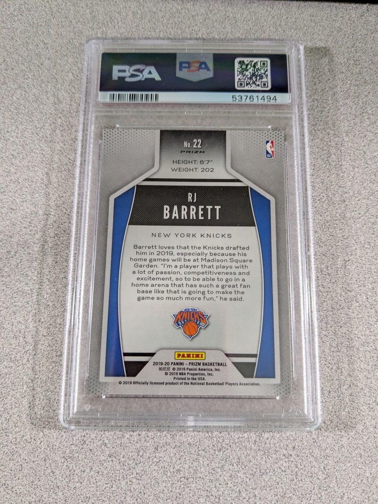 Capture a piece of basketball history with the 2019-20 Panini Prizm - Instant Impact Silver Prizm #22 RJ Barrett rookie card. Boasting a sleek Silver Prizm parallel, this card highlights the promise of New York Knicks' talent, RJ Barrett, and is a must-have for collectors and fans alike. The card, part of the distinguished Instant Impact insert set, is a testament to Barrett's potential and a valuable asset for those looking to invest in basketball's future stars.This card comes from the respected Panini Prizm set, known for its quality and desirability among enthusiasts. Certified with number 53761494 and graded as 275022 by professional graders, it ensures authenticity and a high standard of preservation. Whether you're expanding your collection or gifting a piece of the NBA's exciting new generation, this RJ Barrett card stands out as a significant piece of sports memorabilia.