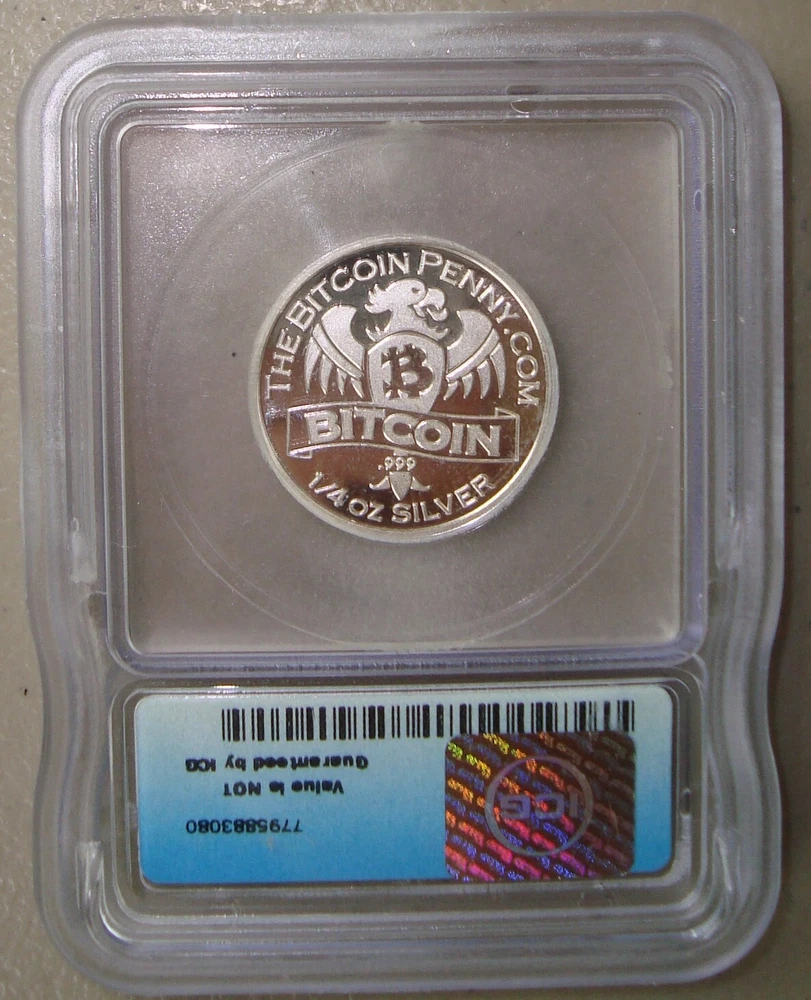 Auction Title: 2019-AG Bitcoin Penny, Eagle Right - 700 Mintage 1/4 oz .999 Silver ICG MS64+ PL Description: This listing is for a 2019-AG Bitcoin Penny, Eagle Right 1/4 oz .999 silver issue that has been certified MS64+ PL by ICG. Just 700 were struck across all silver varieties in 2019. Free shipping in the US, satisfaction is guaranteed. Important Policies - Please Read Before Bidding Feedback: We are one of the longest standing companies on eBay, registered since September 1998. Our feedback percentage of over 99.9% and 4.9 stars or higher out of 5 in every major category shows our commitment to customer service and puts us in the very top of eBay sellers. If ever there is a problem with your order please contact us right away so we can take care of it for you. Shipping Information Items sent to US addresses generally arrive in a week or less, items sent internationally usually arrive in 2 weeks or less. Please allow adequate time for your item to arrive. Back to Top