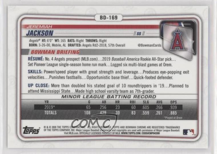 2020 Bowman Chrome Draft Sapphire Edition - [Base] - Aqua #BD-169 Jeremiah Jackson Qty Made: 20 - Rookie - Baseball Card - Featuring the Los Angeles Angels - Featuring Jeremiah Jackson Search for more: 2020 Bowman Chrome Draft Sapphire Edition Search for more: 2020 Bowman Chrome Draft Sapphire Edition - [Base] - Aqua View all of our Listings Auctions Buy It Now About Us Located in the beautiful Pacific Northwest, COMC (Check Out My Cards) is the world's largest consignment service for trading card singles. More than 10,000 people have used our consignment service to list over 50 million trading cards. Find out how we can help you consign your items on eBay by contacting us through eBay messaging. COMC -- "The Safe & Easy Way to Buy & Sell" Representative Image - Select Specific Item above to see image of actual item Representative Image - Select Specific Item above to see image of actual item Raw Condition for Modern Cards Unless otherwise noted, raw modern cards are listed in Near Mint-Mint condition or better. A NM-MT card appears to be Mint at first glance, but upon closer inspection, may exhibit some of the following: minor print defects (e.g. roller marks, print line, dimple), minor scratches, slight edge wear, and slight corner wear. Centering is clearly visible in the images provided and does not factor into our condition assessment. Raw Condition for Vintage Cards Unless otherwise noted, raw vintage cards are listed in Excellent condition or better. An EX card may exhibit some of the following: minor rounding of corners, surface wear, print defects, light scratches, and slight edge wear/chipping. Centering is clearly visible in the images provided and does not factor into our condition assessment. Domestic Shipping Combined shipping for multiple items is available. To receive combined shipping, please ensure all desired items are in your eBay shopping cart before proceeding to checkout. eBay limits orders to 40 items per order. We automatically combine multiple orders placed on the same day. If you place multiple orders on the same day, please contact us to request a refund of applicable shipping costs. Signature confirmation may be required on invoices over $400. All cards are protected and shipped securely. International Shipping COMC offers eBay's International Shipping (EIS) for international orders under $2,500* (see country exceptions below). All duties and import fees are paid at checkout; in the rare event that there are additional import fees upon delivery, these are borne by the buyer. EIS packages route through a shipping hub in Erlanger, KY before shipping to their final destination. Please note that EIS does not allow for combined shipments. The shipping rates are determined by eBay and cannot be adjusted. *Maximum sale price exceptions: Colombia, Kuwait ($2,000); Taiwan ($1,539); Chile, Costa Rica, Guatemala, Honduras, Trinidad and Tobago ($1,000); Antigua and Barbuda, Aruba, Belize, Dominica, Grenada, Philippines, Saint Kitts and Nevis, Saint Lucia, Montserrat, Turks and Caicos Islands ($500); Dominican Republic, El Salvador ($200). Please request a shipping quote through eBay messaging for orders that exceed the maximum sale price supported by eBay's International Shipping. You will be responsible for all duties and import fees for international orders shipped outside the EIS. All cards are protected and shipped securely. Payment COMC does not accept offers on our cards through our eBay storefront. COMC utilizes eBay’s managed payments system. If you are experiencing difficulties making a payment, please contact eBay for assistance. Return Policy Returns are only accepted on the rare occasion the item is not as described. If you are making a return, please initiate the return process through eBay so a mailing label can be provided for you. Prior to listing, our expert team carefully assessed this item to represent it accurately. Please review the description and high-definition images prior to purchasing to ensure this item meets your satisfaction. We welcome you to contact us if you have further questions about this item. Trust and Integrity COMC carefully assesses each item consigned to us to prevent fraudulent items from entering the marketplace. If you believe an item offered on COMC may be fraudulent, please contact us with details so we can investigate the issue. Items we determine are outside our supported items policy may be removed. Last Modified: 2/24/2025 4:57:41 PM PDT