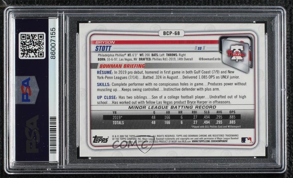 2020 Bowman - Chrome Prospects - Blue Refractor #BCP-68 Bryson Stott Qty Made: 150 Graded PSA 10 GEM MT - Rookie - Baseball Card - Featuring the Philadelphia Phillies - Featuring Bryson Stott Search for more: 2020 Bowman Search for more: 2020 Bowman - Chrome Prospects - Blue Refractor View all of our Listings Auctions Buy It Now About Us Located in the beautiful Pacific Northwest, COMC (Check Out My Cards) is the world's largest consignment service for trading card singles. More than 10,000 people have used our consignment service to list over 50 million trading cards. We currently house 20 million cards, each listed for sale with front and back images of the actual card. Find out how we can help you consign your items on eBay by contacting us through eBay messaging. COMC -- "The Safe & Easy Way to Buy & Sell" Representative Image - Select Specific Item above to see image of actual item Representative Image - Select Specific Item above to see image of actual item Raw Condition for Modern Cards Unless otherwise noted, raw modern cards are listed in Near Mint-Mint condition or better. A NM-MT card appears to be Mint at first glance, but upon closer inspection, may exhibit some of the following: minor print defects (e.g. roller marks, print line, dimple), minor scratches, slight edge wear, and slight corner wear. Centering is clearly visible in the images provided and does not factor into our condition assessment. Raw Condition for Vintage Cards Unless otherwise noted, raw vintage cards are listed in Excellent condition or better. An EX card may exhibit some of the following: minor rounding of corners, surface wear, print defects, light scratches, and slight edge wear/chipping. Centering is clearly visible in the images provided and does not factor into our condition assessment. Domestic Shipping Combined shipping for multiple items is available. To receive combined shipping, please ensure all desired items are in your eBay shopping cart before proceeding to checkout. eBay limits orders to 40 items per order. We automatically combine multiple orders placed on the same day. If you place multiple orders on the same day, please contact us to request a refund of applicable shipping costs. Signature confirmation may be required on invoices over $400. Raw cards are shipped in toploaders. International Shipping COMC offers eBay's International Shipping (EIS) for international orders under $2,500* (see country exceptions below). All duties and import fees are paid at checkout; in the rare event that there are additional import fees upon delivery, these are borne by the buyer. EIS packages route through a shipping hub in Erlanger, KY before shipping to their final destination. Please note that EIS does not allow for combined shipments. The shipping rates are determined by eBay and cannot be adjusted. *Maximum sale price exceptions: Colombia, Kuwait ($2,000); Taiwan ($1,539); Chile, Costa Rica, Guatemala, Honduras, Trinidad and Tobago ($1,000); Antigua and Barbuda, Aruba, Belize, Dominica, Grenada, Philippines, Saint Kitts and Nevis, Saint Lucia, Montserrat, Turks and Caicos Islands ($500); Dominican Republic, El Salvador ($200). Please request a shipping quote through eBay messaging for orders that exceed the maximum sale price supported by eBay's International Shipping. You will be responsible for all duties and import fees for international orders shipped outside the EIS. Raw cards are shipped in toploaders. Payment COMC does not accept offers on our cards through our eBay storefront. COMC utilizes eBay’s managed payments system. If you are experiencing difficulties making a payment, please contact eBay for assistance. Return Policy Returns are only accepted on the rare occasion the item is not as described. If you are making a return, please initiate the return process through eBay so a mailing label can be provided for you. Prior to listing, our expert team carefully assessed this item to represent it accurately. Please review the description and high-definition images prior to purchasing to ensure this item meets your satisfaction. We welcome you to contact us if you have further questions about this item. Trust and Integrity COMC carefully assesses each item consigned to us to prevent fraudulent items from entering the marketplace. If you believe an item offered on COMC may be fraudulent, please contact us with details so we can investigate the issue. Items we determine are outside our supported items policy may be removed. Last Modified: 12/30/2024 5:24:29 PM PDT