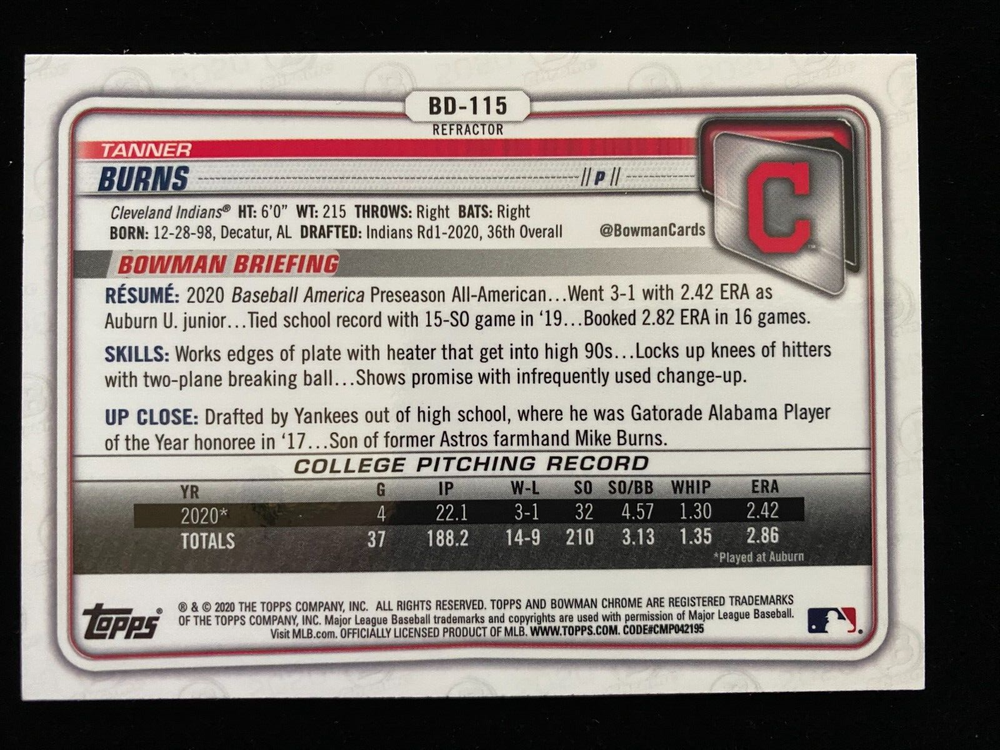 2020 Bowman Chrome Draft TANNER BURNS 1st Rookie REFRACTOR #BD-115 Cleveland Guardians RC SP QUANTITY (1) Chrome REFRACTOR #BD-115 All cards are at least NRMT unless noted. Some raw cards I list are potential GEM Mint Cards, but please note that all raw ungraded cards may contain pixelated dimples, scratches, printer lines, indents, edge chipping or corner whitening, along with other common condition issues. The card/s pictured in each listing is the card/s received, if you have condition questions please ask. If you're looking for guaranteed GEM MINT 10 cards then I suggest buying cards that are already graded. I will not accept returns under any circumstances, buying sports cards is similar to buying stocks and you cannot return stocks, so please do not try and return the card to me. Most are pulled by me directly from packs and immediately put into sleeves, I do not inspect every card for every potential flaw, so card/s could have no flaws. Card ships USPS, if the card sells for under $20 it will be shipped in PWE, if the card sells for more than $20 it will ship GROUND ADVANTAGE, regardless of S&H cost, I don't know how much the card is going to sell for before it's sold, so I'm just guessing. If auction ends for less than $20 and you would like me to ship in a bubble mailer, please let me know before paying for the auction and I will send an updated invoice. If Auction sells for more than $20 with a low S&H charge I will cover additional cost to ship. Combined shipping is available, at roughly one dollar per additional Listing, with a cap around $10 depending on weight.