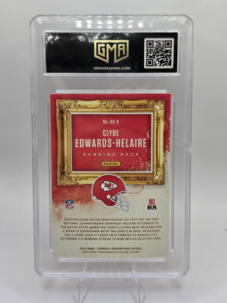 Elevate your collection with the Clyde Edwards-Helaire Gridiron Kings Rookie Card from the 2020 Panini Chronicles, card number GK-8. This piece celebrates the Kansas City Chiefs' running back in his NFL debut season, capturing the excitement of the Super Bowl with a sleek, chrome finish. The card is a must-have for fans and collectors alike, featuring a dynamic rookie who has left his mark on the field. Crafted in the United States, this standard-sized card is an original piece of sports memorabilia from the National Football League's 2020 season. It is a base set card that has been professionally graded by Gem Mint Authentication (GMA) with a score of 9, ensuring its high quality and collectible status. Whether for investment or as a cherished piece of football history, this Clyde Edwards-Helaire rookie card is a noteworthy acquisition for any collector.