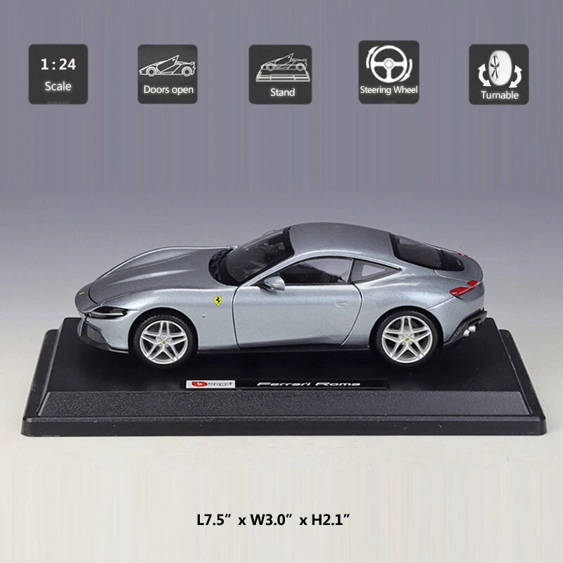 2020 Ferrari Roma Model Car 1/24 Scale Diecast Metal Vehicle Collection Silver Item Type Diecast & Toy Vehicles Scale 1:24 Material Diecast and ABS Color Silver-gray Dimension About L7.5" x W3.0" x H2.1" (L19.0 x W7.7 x H5.4 cm) Vehicle Type Supercar Function *Two doors, engine cover and trunk lid can be open *The front wheels can turn left and right by turning the steering wheel Packing Packed in original color box, in excellent condition Tips *Great choice of gift for kids, especially for Birthday, Christmas and New Year Gift *Great item for collector, business gift, home decoration, office decoration, display Warning Don't put in mouth/Keep Away from Fire/Not for Children under 3 Years Notice Due to manual measurement, please allow a little error Package include 1 x 1:24 Scale Ferrari Roma Model Car Payment Delivery details Terms of sales Payment We accept paypal only. Delivery details We ship orders within 24 hours upon receipt of payment. Terms of sales We provide great products and service. If you have any problems with the order,please do contact us before leaving negative feedback and opening case on eBay.