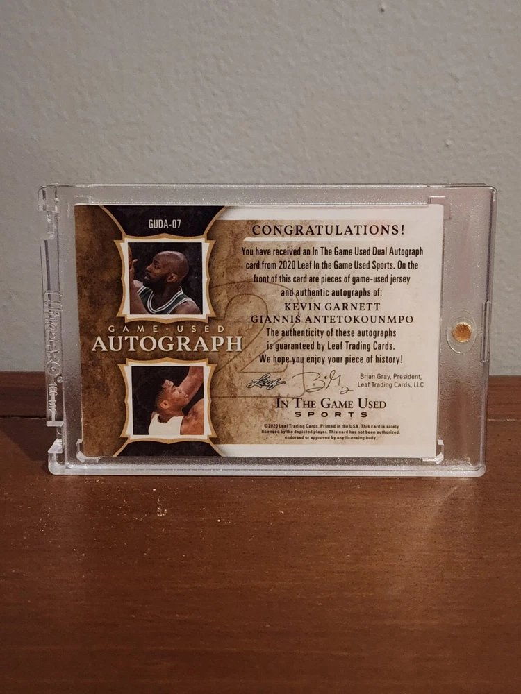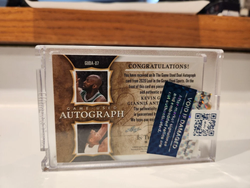 2020 IN THE GAME USED JERSEY AUTO 4/4 GIANNIS ANTETOKOUNMPO AND KEVIN GARNETT . VERY RARE CARD AND VERY LAST ONE! THESE TWO BIG MEN ARE ARGUABLY THE BEST BIG MEN EVER!