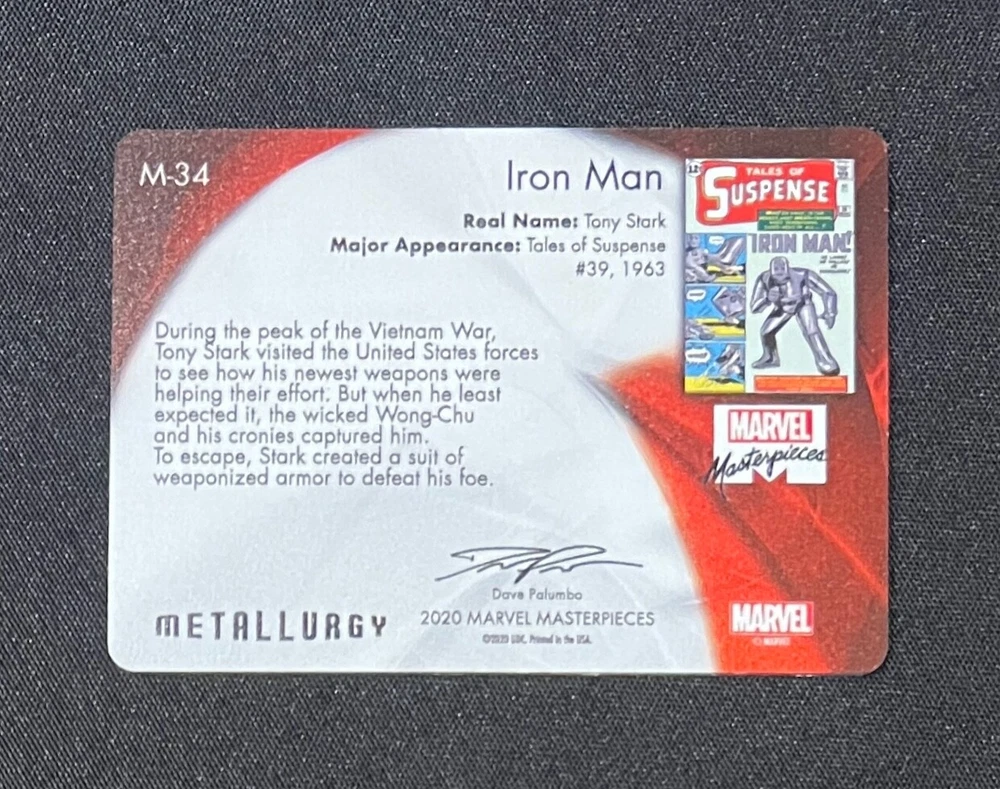 2020 MARVEL MASTERPIECES # 34 IRON MAN /25 METALLURGY INSERT CARD. THIS IS THE FIRST CARD IN THE SERIAL NUMBERS, ALSO KNOWN AS ALPHA (01/25). CASE HIT METAL CARD M-34 IS IN GREAT (NM/M) OR BETTER. ALL MY ITEMS COME FROM A SMOKE-FREE HOUSE. SHIPMENT WILL BE SENT IN 2 DAYS OF PAYMENT. I WILL SHIP THIS CARD IN THE GREATEST OF CARE. BUYERS OUTSIDE OF THE CONTINENTAL U.S. MAY HAVE TO PAY EXTRA FOR SHIPPING. I DO OFFER COMBINE SHIPPING RATES. SO PLEASE CHECK OUT MY OTHER ITEMS. FEEL FREE TO MESSAGE ME WITH ANY QUESTIONS. THANKS FOR LOOKING AND GOOD LUCK.