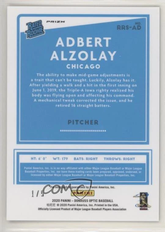 Cards Template Stock #: 071 Sport/Game: MLB Licensing: Donruss Raw/Graded: Raw Year: 2020 Player Name(s): Adbert Alzolay Parallel/Variety: Green Numered Rookie Numbered: 4/5 Rookie: Yes Autograph: No Patch: No Approximate Condition: Weird mark on the bottom right hand corner Pet Free Home/Odor Fragrance Free Will Be Shipped As If I Was Grading It, Very Secure Stock #: Please Send Offers If Interested