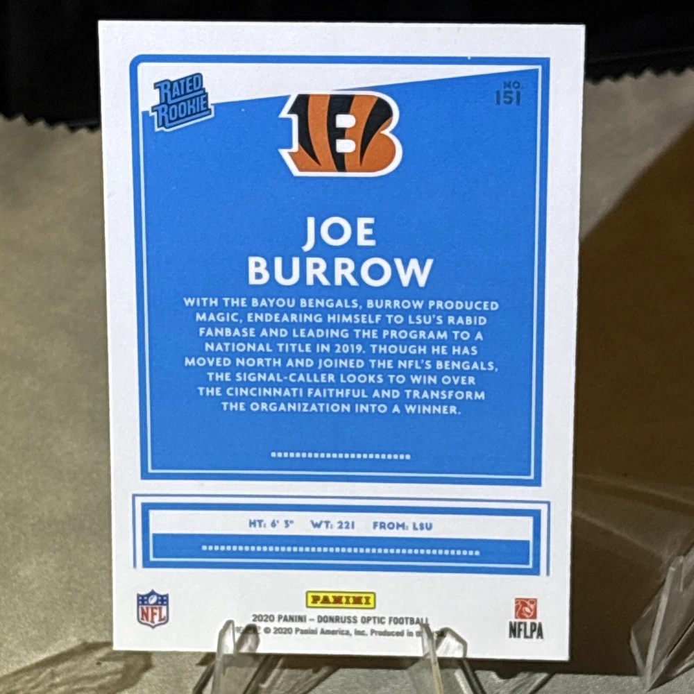 Card Size: Standard Graded: No Country/Region of Manufacture: United States Type: Sports Trading Card Parallel/Variety: Optic Features: Base Set, Rookie Original/Licensed Reprint: Original Team: Cincinnati Bengals Vintage: No Player/Athlete: Joe Burrow Card Condition: Near Mint or Better Material: Card Stock League: National Football League (NFL) Manufacturer: Panini Sport: Football Card Number: 151 Autographed: No Year Manufactured: 2020 Event/Tournament: Super Bowl Set: 2020 Panini Donruss Optic Season: 2020