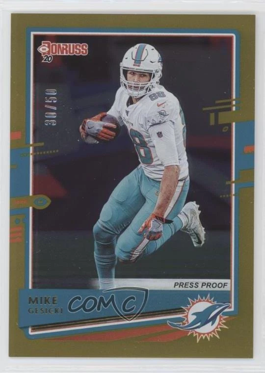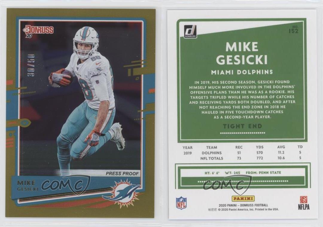 2020 Panini Donruss - [Base] - Press Proof Gold #152 Mike Gesicki Qty Made: 50 - Football Card - Featuring the Miami Dolphins - Featuring Mike Gesicki Search for more: 2020 Panini Donruss Search for more: 2020 Panini Donruss - [Base] - Press Proof Gold View all of our Listings Auctions Buy It Now About Us Located in the beautiful Pacific Northwest, COMC (Check Out My Cards) is the world's largest consignment service for trading card singles. More than 10,000 people have used our consignment service to list over 50 million trading cards. We currently house 20 million cards, each listed for sale with front and back images of the actual card. Find out how we can help you consign your items on eBay by contacting us through eBay messaging. COMC -- "The Safe & Easy Way to Buy & Sell" Representative Image - Select Specific Item above to see image of actual item Representative Image - Select Specific Item above to see image of actual item Raw Condition for Modern Cards Unless otherwise noted, raw modern cards are listed in Near Mint-Mint condition or better. A NM-MT card appears to be Mint at first glance, but upon closer inspection, may exhibit some of the following: minor print defects (e.g. roller marks, print line, dimple), minor scratches, slight edge wear, and slight corner wear. Centering is clearly visible in the images provided and does not factor into our condition assessment. Raw Condition for Vintage Cards Unless otherwise noted, raw vintage cards are listed in Excellent condition or better. An EX card may exhibit some of the following: minor rounding of corners, surface wear, print defects, light scratches, and slight edge wear/chipping. Centering is clearly visible in the images provided and does not factor into our condition assessment. Domestic Shipping Combined shipping for multiple items is available. To receive combined shipping, please ensure all desired items are in your eBay shopping cart before proceeding to checkout. eBay limits orders to 40 items per order. We automatically combine multiple orders placed on the same day. If you place multiple orders on the same day, please contact us to request a refund of applicable shipping costs. Signature confirmation may be required on invoices over $400. Raw cards are shipped in toploaders. International Shipping COMC offers eBay's International Shipping (EIS) for international orders under $2,500* (see country exceptions below). All duties and import fees are paid at checkout; in the rare event that there are additional import fees upon delivery, these are borne by the buyer. EIS packages route through a shipping hub in Erlanger, KY before shipping to their final destination. Please note that EIS does not allow for combined shipments. The shipping rates are determined by eBay and cannot be adjusted. *Maximum sale price exceptions: Colombia, Kuwait ($2,000); Taiwan ($1,539); Chile, Costa Rica, Guatemala, Honduras, Trinidad and Tobago ($1,000); Antigua and Barbuda, Aruba, Belize, Dominica, Grenada, Philippines, Saint Kitts and Nevis, Saint Lucia, Montserrat, Turks and Caicos Islands ($500); Dominican Republic, El Salvador ($200). Please request a shipping quote through eBay messaging for orders that exceed the maximum sale price supported by eBay's International Shipping. You will be responsible for all duties and import fees for international orders shipped outside the EIS. Raw cards are shipped in toploaders. Payment COMC does not accept offers on our cards through our eBay storefront. COMC utilizes eBay’s managed payments system. If you are experiencing difficulties making a payment, please contact eBay for assistance. Return Policy Returns are only accepted on the rare occasion the item is not as described. If you are making a return, please initiate the return process through eBay so a mailing label can be provided for you. Prior to listing, our expert team carefully assessed this item to represent it accurately. Please review the description and high-definition images prior to purchasing to ensure this item meets your satisfaction. We welcome you to contact us if you have further questions about this item. Trust and Integrity COMC carefully assesses each item consigned to us to prevent fraudulent items from entering the marketplace. If you believe an item offered on COMC may be fraudulent, please contact us with details so we can investigate the issue. Items we determine are outside our supported items policy may be removed. Last Modified: 10/19/2024 4:45:17 AM PDT