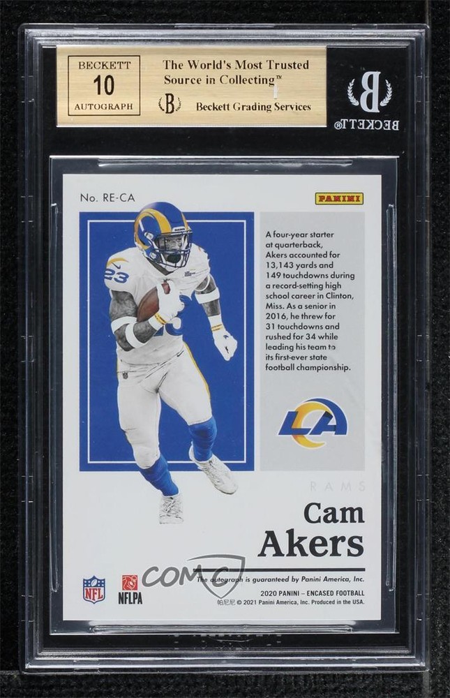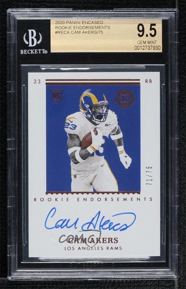 2020 Panini Encased - Rookie Endorsements #RE-CA Cam Akers Qty Made: 75 Graded BGS 9.5 GEM MINT - Rookie - Football Card - Featuring the Los Angeles Rams - Featuring Cam Akers Search for more: 2020 Panini Encased Search for more: 2020 Panini Encased - Rookie Endorsements View all of our Listings Auctions Buy It Now About Us Located in the beautiful Pacific Northwest, COMC (Check Out My Cards) is the world's largest consignment service for trading card singles. More than 10,000 people have used our consignment service to list over 50 million trading cards. Find out how we can help you consign your items on eBay by contacting us through eBay messaging. COMC -- "The Safe & Easy Way to Buy & Sell" Representative Image - Select Specific Item above to see image of actual item Representative Image - Select Specific Item above to see image of actual item Raw Condition for Modern Cards Unless otherwise noted, raw modern cards are listed in Near Mint-Mint condition or better. A NM-MT card appears to be Mint at first glance, but upon closer inspection, may exhibit some of the following: minor print defects (e.g. roller marks, print line, dimple), minor scratches, slight edge wear, and slight corner wear. Centering is clearly visible in the images provided and does not factor into our condition assessment. Raw Condition for Vintage Cards Unless otherwise noted, raw vintage cards are listed in Excellent condition or better. An EX card may exhibit some of the following: minor rounding of corners, surface wear, print defects, light scratches, and slight edge wear/chipping. Centering is clearly visible in the images provided and does not factor into our condition assessment. Domestic Shipping Combined shipping for multiple items is available. To receive combined shipping, please ensure all desired items are in your eBay shopping cart before proceeding to checkout. eBay limits orders to 40 items per order. We automatically combine multiple orders placed on the same day. If you place multiple orders on the same day, please contact us to request a refund of applicable shipping costs. Signature confirmation may be required on invoices over $400. All cards are protected and shipped securely. International Shipping COMC offers eBay's International Shipping (EIS) for international orders under $2,500* (see country exceptions below). All duties and import fees are paid at checkout; in the rare event that there are additional import fees upon delivery, these are borne by the buyer. EIS packages route through a shipping hub in Erlanger, KY before shipping to their final destination. Please note that EIS does not allow for combined shipments. The shipping rates are determined by eBay and cannot be adjusted. *Maximum sale price exceptions: Colombia, Kuwait ($2,000); Taiwan ($1,539); Chile, Costa Rica, Guatemala, Honduras, Trinidad and Tobago ($1,000); Antigua and Barbuda, Aruba, Belize, Dominica, Grenada, Philippines, Saint Kitts and Nevis, Saint Lucia, Montserrat, Turks and Caicos Islands ($500); Dominican Republic, El Salvador ($200). Please request a shipping quote through eBay messaging for orders that exceed the maximum sale price supported by eBay's International Shipping. You will be responsible for all duties and import fees for international orders shipped outside the EIS. All cards are protected and shipped securely. Payment COMC does not accept offers on our cards through our eBay storefront. COMC utilizes eBay’s managed payments system. If you are experiencing difficulties making a payment, please contact eBay for assistance. Return Policy Returns are only accepted on the rare occasion the item is not as described. If you are making a return, please initiate the return process through eBay so a mailing label can be provided for you. Prior to listing, our expert team carefully assessed this item to represent it accurately. Please review the description and high-definition images prior to purchasing to ensure this item meets your satisfaction. We welcome you to contact us if you have further questions about this item. Trust and Integrity COMC carefully assesses each item consigned to us to prevent fraudulent items from entering the marketplace. If you believe an item offered on COMC may be fraudulent, please contact us with details so we can investigate the issue. Items we determine are outside our supported items policy may be removed. Last Modified: 3/2/2025 7:19:45 AM PDT