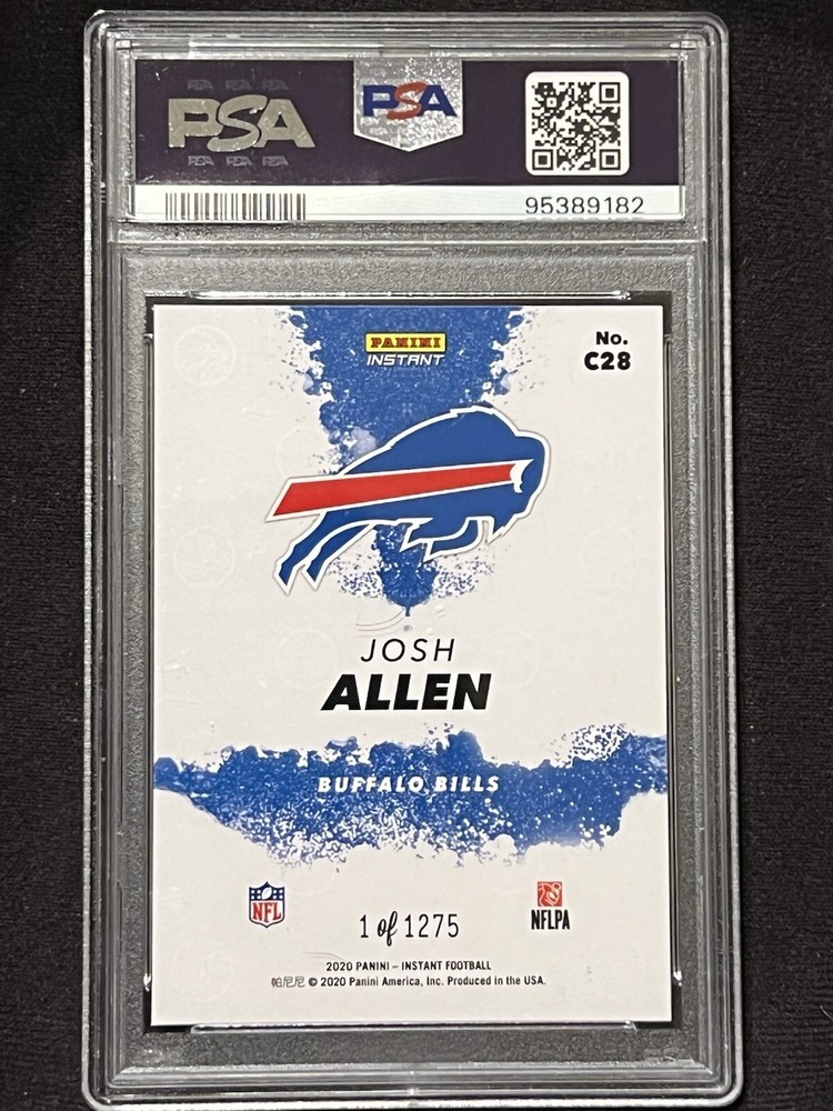 Capture a piece of sports history with the 2020 Panini Instant Josh Allen My City card, limited to just 1275 prints. This card celebrates Josh Allen's impact with the Buffalo Bills and is a must-have for fans and collectors alike. It's a standard-sized, original piece that's been professionally graded by PSA to a commendable score of 9, ensuring its quality and authenticity. Crafted by Panini, a trusted name in sports memorabilia, this card is not autographed and features unique serial numbering, making it a short print exclusive. Proudly manufactured in the United States, it belongs to the 2020 Panini set and carries the card number C28. Add this gem to your collection and own a snapshot of the 2020 NFL season.