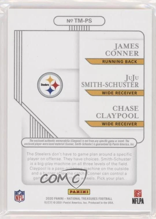 2020 Panini National Treasures - NFL Gear Trio Materials #TM-PS Chase Claypool, James Conner, JuJu Smith-Schuster Qty Made: 99 - Rookie - Football Card - Featuring the Pittsburgh Steelers - Featuring Chase Claypool , James Conner and JuJu Smith-Schuster Search for more: 2020 Panini National Treasures Search for more: 2020 Panini National Treasures - NFL Gear Trio Materials View all of our Listings Auctions Buy It Now About Us Located in the beautiful Pacific Northwest, COMC (Check Out My Cards) is the world's largest consignment service for trading card singles. More than 10,000 people have used our consignment service to list over 50 million trading cards. We currently house 20 million cards, each listed for sale with front and back images of the actual card. Find out how we can help you consign your items on eBay by contacting us through eBay messaging. COMC -- "The Safe & Easy Way to Buy & Sell" Representative Image - Select Specific Item above to see image of actual item Representative Image - Select Specific Item above to see image of actual item Raw Condition for Modern Cards Unless otherwise noted, raw modern cards are listed in Near Mint-Mint condition or better. A NM-MT card appears to be Mint at first glance, but upon closer inspection, may exhibit some of the following: minor print defects (e.g. roller marks, print line, dimple), minor scratches, slight edge wear, and slight corner wear. Centering is clearly visible in the images provided and does not factor into our condition assessment. Raw Condition for Vintage Cards Unless otherwise noted, raw vintage cards are listed in Excellent condition or better. An EX card may exhibit some of the following: minor rounding of corners, surface wear, print defects, light scratches, and slight edge wear/chipping. Centering is clearly visible in the images provided and does not factor into our condition assessment. Domestic Shipping Combined shipping for multiple items is available. To receive combined shipping, please ensure all desired items are in your eBay shopping cart before proceeding to checkout. eBay limits orders to 40 items per order. We automatically combine multiple orders placed on the same day. If you place multiple orders on the same day, please contact us to request a refund of applicable shipping costs. Signature confirmation may be required on invoices over $400. Raw cards are shipped in toploaders. International Shipping COMC offers eBay's International Shipping (EIS) for international orders under $2,500* (see country exceptions below). All duties and import fees are paid at checkout; in the rare event that there are additional import fees upon delivery, these are borne by the buyer. EIS packages route through a shipping hub in Erlanger, KY before shipping to their final destination. Please note that EIS does not allow for combined shipments. The shipping rates are determined by eBay and cannot be adjusted. *Maximum sale price exceptions: Colombia, Kuwait ($2,000); Taiwan ($1,539); Chile, Costa Rica, Guatemala, Honduras, Trinidad and Tobago ($1,000); Antigua and Barbuda, Aruba, Belize, Dominica, Grenada, Philippines, Saint Kitts and Nevis, Saint Lucia, Montserrat, Turks and Caicos Islands ($500); Dominican Republic, El Salvador ($200). Please request a shipping quote through eBay messaging for orders that exceed the maximum sale price supported by eBay's International Shipping. You will be responsible for all duties and import fees for international orders shipped outside the EIS. Raw cards are shipped in toploaders. Payment COMC does not accept offers on our cards through our eBay storefront. COMC utilizes eBay’s managed payments system. If you are experiencing difficulties making a payment, please contact eBay for assistance. Return Policy Returns are only accepted on the rare occasion the item is not as described. If you are making a return, please initiate the return process through eBay so a mailing label can be provided for you. Prior to listing, our expert team carefully assessed this item to represent it accurately. Please review the description and high-definition images prior to purchasing to ensure this item meets your satisfaction. We welcome you to contact us if you have further questions about this item. Trust and Integrity COMC carefully assesses each item consigned to us to prevent fraudulent items from entering the marketplace. If you believe an item offered on COMC may be fraudulent, please contact us with details so we can investigate the issue. Items we determine are outside our supported items policy may be removed. Last Modified: 10/15/2024 12:28:29 AM PDT