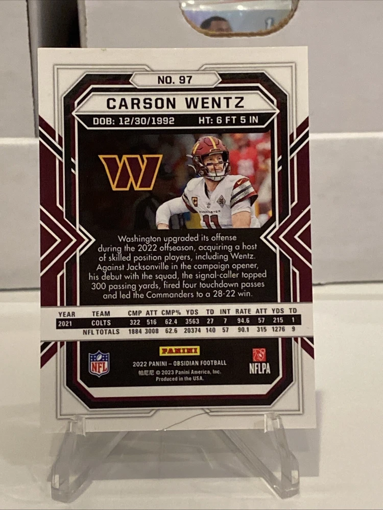 This 2020 Panini Obsidian trading card features Carson Wentz, the talented quarterback for the Philadelphia Eagles. The card is a true white contra SSP, with a hologram, short print, and exclusive insert features. It is an original and licensed reprint, with a card number of V20 and manufactured by Panini. The card is part of the National Football League (NFL) set, and is perfect for any football fan or collector. It is not autographed, but the electric etch white contrast design is stunning and makes this card a must-have. Don't miss your chance to add this rare and unique card to your collection today!