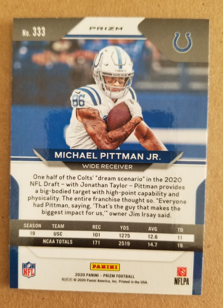 Player/Athlete: Michael Pittman Jr. Set: 2020 Panini Prizm Team: Indianapolis Colts Card Name: Red White & Blue Prizm League: National Football League (NFL) Card Condition: Near mint or better Manufacturer: Panini Card Number: 333 Sport: Football Type: Sports Trading Card Season: 2020 Features: Hologram, Parallel/Variety, Rookie Parallel/Variety: Red White & Blue Prizm Year Manufactured: 2020