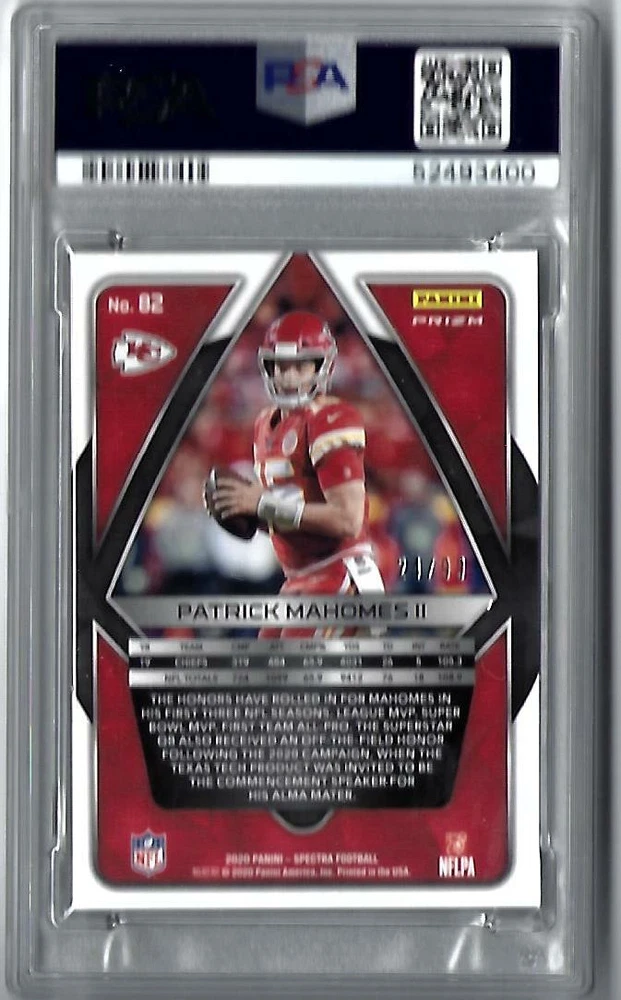 2020 Panini Spectra #82 Patrick Mahomes Silver REFRACTOR 24/99 PSA 10 Gem Mint PSA POP 4 Grab it now while it's still affordable! Patrick Mahomes Cards are SKYROCKETING in Value!!! Makes a GREAT INVESTMENT!! Check out my other listings for more Patrick Mahomes PSA 10 Graded Cards & Rookies A Signature will be required upon delivery