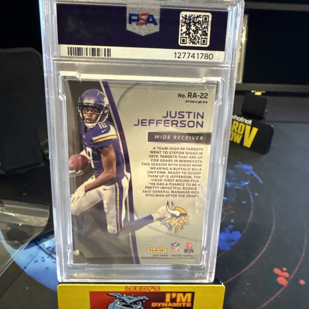 The 2020 Panini Spectra Rookie Aura Justin Jefferson #Neon Blue Prizm /50 card is a highly collectible sports trading card featuring the rookie athlete Justin Jefferson from the Minnesota Vikings. This limited edition card is part of the 2020 Panini Spectra set and is graded as a 9 by Professional Sports Authenticator (PSA). With only 50 copies in existence, this card is a valuable addition to any football card collection, especially for fans of the National Football League (NFL). The neon blue prizm parallel variety adds a unique and eye-catching element to the card, making it a sought-after item for collectors.
