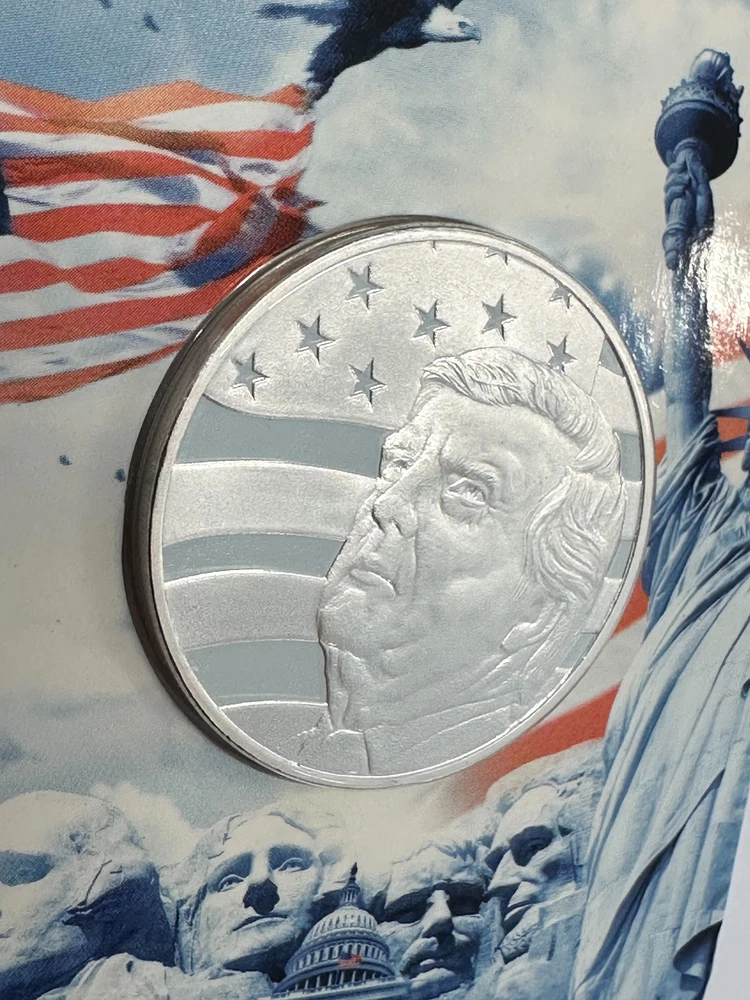 Collectible 1 Troy Ounce President Trump 99.9% Fine Silver Prooflike Round - carded. Obverse: Portrait of Donald Trump with Waving American Flag Behind Him Reverse: "Trump for President 2020 45" "One Oz. 999 Silver" and the White House. This silver round is minted by Blockchain Mint and made in Singapore. Some toning to coin - mostly on reverse towards edges. PLEASE NOTE : If bidding on multiple items with us, please WAIT and pay altogether to get a shipping discount automatically applied. (Ignore automatic prompts from eBay asking for immediate payment.) It is fine to wait up to 1 week before paying if bidding on multiple items. Other requests for combined shipping may not be possible due to administrative and logistical factors. INTERNATIONAL CUSTOMERS: Please send us a message with your direct contact email address as this is required for customs clearance. Failure to provide an email will result in delays and possible returns by customs. Thank you. Powered by WonderLister Desktop App
