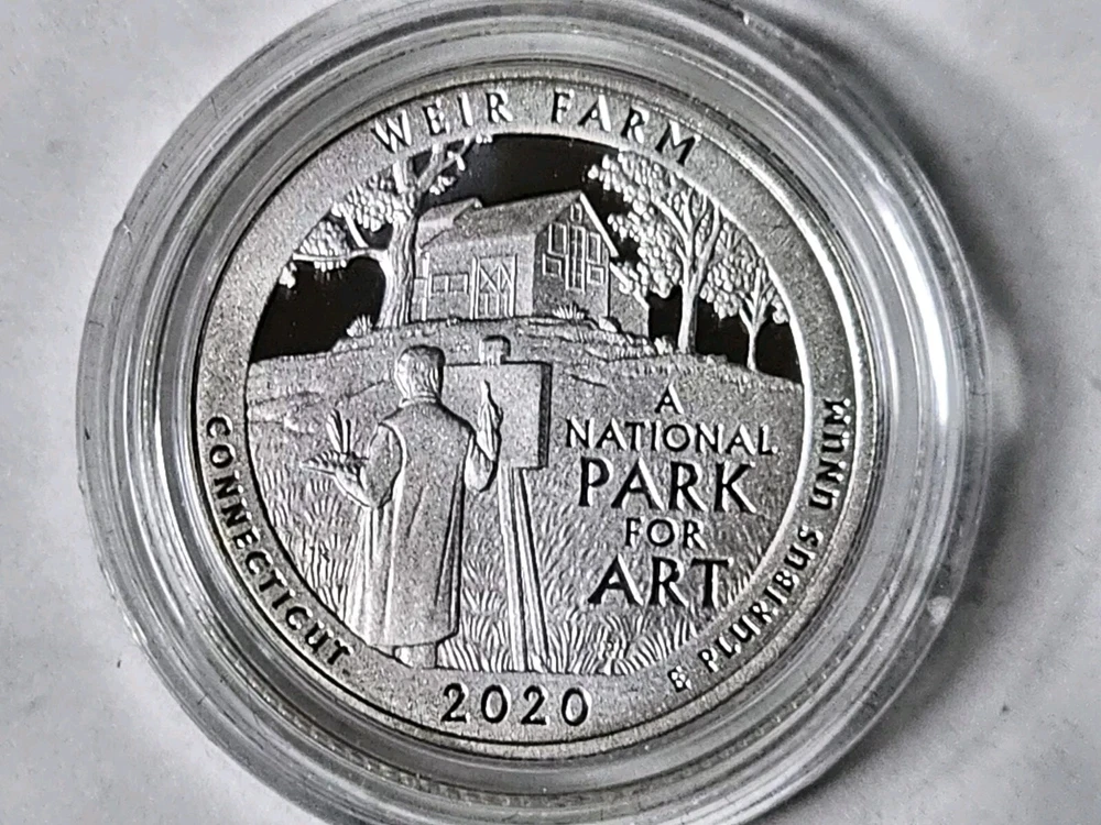 NO CAPSULE This 2020 S Weir Farm NP National Park Quarter Silver Proof Coin is a must-have for any coin collector. The coin is composed of 0.999 silver, and it has a proof strike type with a fineness of 0.999. The coin is uncirculated and comes with an uncertified certification. It has a denomination of 25C and features the Weir Farm variety. The coin was minted in San Francisco, United States, and is part of the America the Beautiful 2010-Now series.