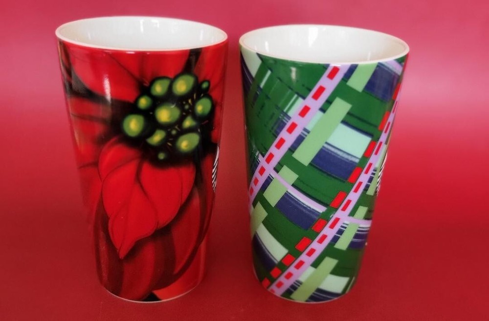 2020 Starbucks Red Poinsettia & Green Plaid Ceramic Coffee Cup Set 16 oz