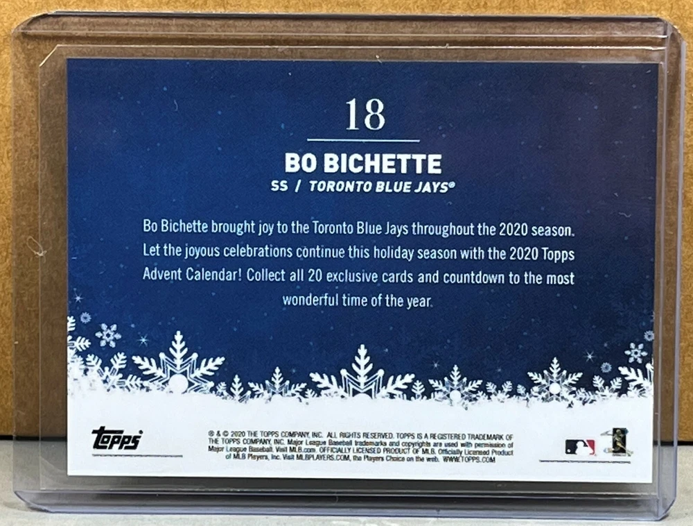 2020 TOPPS ADVENT CALENDAR #18 BO BICHETTE TORONTO BLUE JAYS ROOKIE. Print run of 1023. Worldwide shipping available. U.S. - Winning bidder to add $3.99 for careful USPS first class shipping with delivery confirmation. Add .50 for each additional item. Canada - Winning bidder to add $13.99 for careful USPS air mail shipping. Add $1 for each additional item. All other countries - Winning bidder to add $17.99 for careful USPS air mail shipping. Add $1 for each additional item. Bid with confidence, 49000+ feedback. Thanks and check out my auctions ending every Sunday. Over 800 items ending every Sunday featuring Topps Living singles, Topps Living week sets, Topps Living PSA, Topps Now singles and Topps Now PSA. Please note that combined ship rates are for items paid for on one invoice, thanks!
