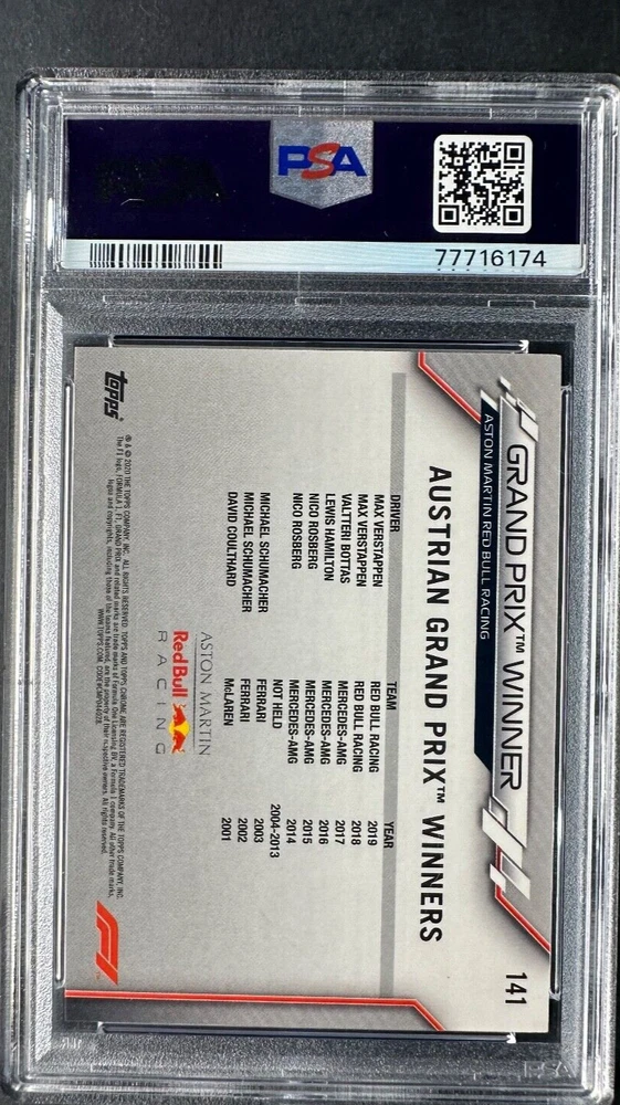 This is a 2020 TOPPS CHROME Formula 1 trading card featuring Max Verstappen of the Aston Martin Red Bull team. The card is a 70th anniversary gold parallel with a PSA10 rating and a POP of 10. This standard-sized card is part of the 2020 TOPPS CHROME FORMULA 1 set and is an ideal addition to any Formula 1 fan's collection. The card showcases an Orange Refractor design and is not autographed. Get your hands on this rare and valuable sports trading card today!