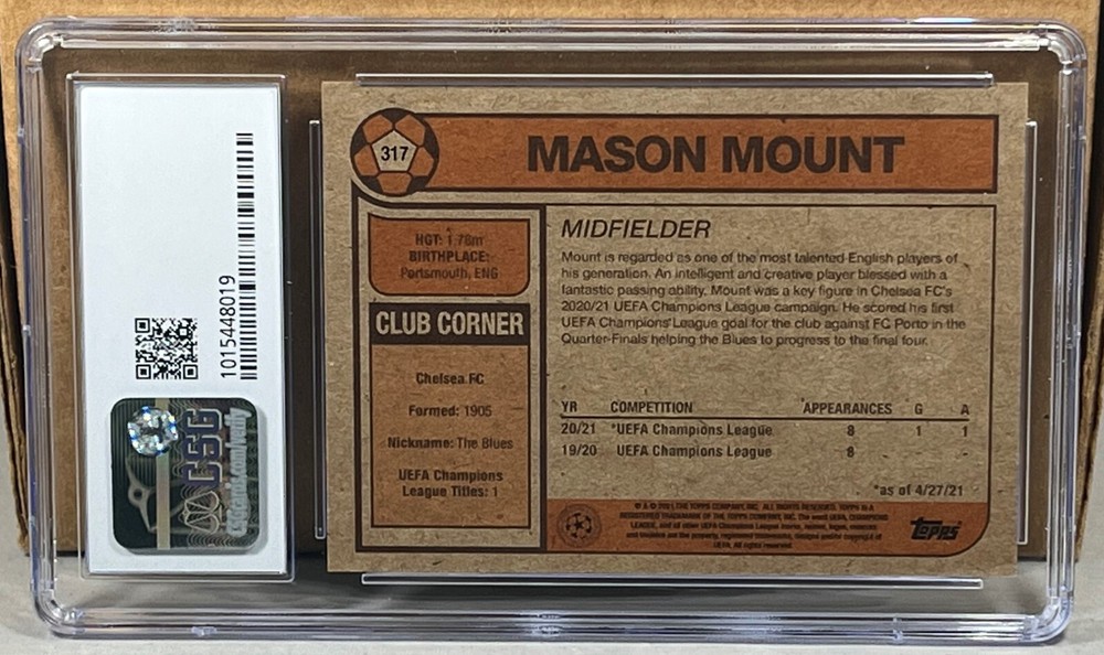 2020 TOPPS LIVING SET UEFA Champions League #317 MASON MOUNT CHELSEA FC GRADED CSG 9.5 GEM MINT. CSG serial #1015448019. Worldwide shipping available. U.S. - Winning bidder to add $3.99 for careful USPS first class shipping with delivery confirmation. Add .50 for each additional item. Canada - Winning bidder to add $14.99 for careful USPS air mail shipping. Add $1 for each additional item. All other countries - Winning bidder to add $19.99 for careful USPS air mail shipping. Add $1 for each additional item. Bid with confidence, 49000+ feedback. Thanks and check out my auctions ending every Sunday. Please note that combined ship rates are for items paid for on one invoice, thanks!
