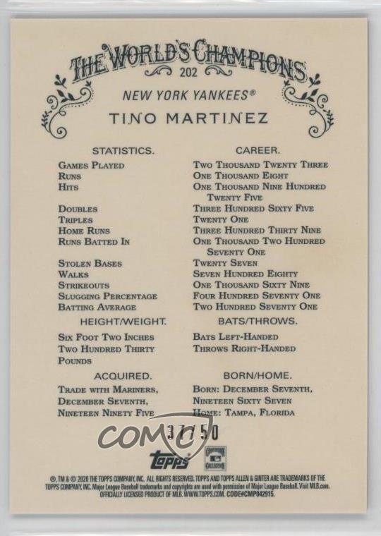 2020 Topps Allen & Ginter Chrome - [Base] - Gold Refractor #202 Tino Martinez Qty Made: 50 - Baseball Card - Featuring the New York Yankees - Featuring Tino Martinez Search for more: 2020 Topps Allen & Ginter Chrome Search for more: 2020 Topps Allen & Ginter Chrome - [Base] - Gold Refractor View all of our Listings Auctions Buy It Now About Us Located in the beautiful Pacific Northwest, COMC (Check Out My Cards) is the world's largest consignment service for trading card singles. More than 10,000 people have used our consignment service to list over 50 million trading cards. Find out how we can help you consign your items on eBay by contacting us through eBay messaging. COMC -- "The Safe & Easy Way to Buy & Sell" Representative Image - Select Specific Item above to see image of actual item Representative Image - Select Specific Item above to see image of actual item Raw Condition for Modern Cards Unless otherwise noted, raw modern cards are listed in Near Mint-Mint condition or better. A NM-MT card appears to be Mint at first glance, but upon closer inspection, may exhibit some of the following: minor print defects (e.g. roller marks, print line, dimple), minor scratches, slight edge wear, and slight corner wear. Centering is clearly visible in the images provided and does not factor into our condition assessment. Raw Condition for Vintage Cards Unless otherwise noted, raw vintage cards are listed in Excellent condition or better. An EX card may exhibit some of the following: minor rounding of corners, surface wear, print defects, light scratches, and slight edge wear/chipping. Centering is clearly visible in the images provided and does not factor into our condition assessment. Domestic Shipping Combined shipping for multiple items is available. To receive combined shipping, please ensure all desired items are in your eBay shopping cart before proceeding to checkout. eBay limits orders to 40 items per order. We automatically combine multiple orders placed on the same day. If you place multiple orders on the same day, please contact us to request a refund of applicable shipping costs. Signature confirmation may be required on invoices over $400. All cards are protected and shipped securely. International Shipping COMC offers eBay's International Shipping (EIS) for international orders under $2,500* (see country exceptions below). All duties and import fees are paid at checkout; in the rare event that there are additional import fees upon delivery, these are borne by the buyer. EIS packages route through a shipping hub in Erlanger, KY before shipping to their final destination. Please note that EIS does not allow for combined shipments. The shipping rates are determined by eBay and cannot be adjusted. *Maximum sale price exceptions: Colombia, Kuwait ($2,000); Taiwan ($1,539); Chile, Costa Rica, Guatemala, Honduras, Trinidad and Tobago ($1,000); Antigua and Barbuda, Aruba, Belize, Dominica, Grenada, Philippines, Saint Kitts and Nevis, Saint Lucia, Montserrat, Turks and Caicos Islands ($500); Dominican Republic, El Salvador ($200). Please request a shipping quote through eBay messaging for orders that exceed the maximum sale price supported by eBay's International Shipping. You will be responsible for all duties and import fees for international orders shipped outside the EIS. All cards are protected and shipped securely. Payment COMC does not accept offers on our cards through our eBay storefront. COMC utilizes eBay’s managed payments system. If you are experiencing difficulties making a payment, please contact eBay for assistance. Return Policy Returns are only accepted on the rare occasion the item is not as described. If you are making a return, please initiate the return process through eBay so a mailing label can be provided for you. Prior to listing, our expert team carefully assessed this item to represent it accurately. Please review the description and high-definition images prior to purchasing to ensure this item meets your satisfaction. We welcome you to contact us if you have further questions about this item. Trust and Integrity COMC carefully assesses each item consigned to us to prevent fraudulent items from entering the marketplace. If you believe an item offered on COMC may be fraudulent, please contact us with details so we can investigate the issue. Items we determine are outside our supported items policy may be removed. Last Modified: 2/27/2025 9:45:01 AM PDT