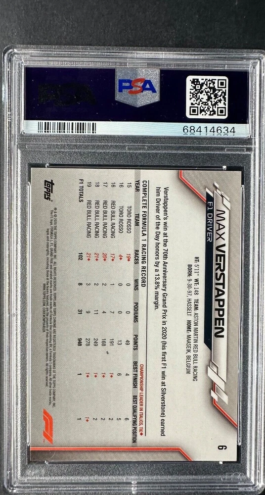 This 2020 Topps Chrome trading card features Max Verstappen, a talented athlete in the Formula 1 league. The card showcases a base portrait of Verstappen and is part of the 2020 Topps Chrome set. It is a sports trading card that is perfect for collectors who appreciate auto racing. This particular card has been graded a PSA 10, ensuring its authenticity and quality. It is an excellent addition to any sports trading card collection and is sure to impress fans of Max Verstappen and Formula 1 racing.