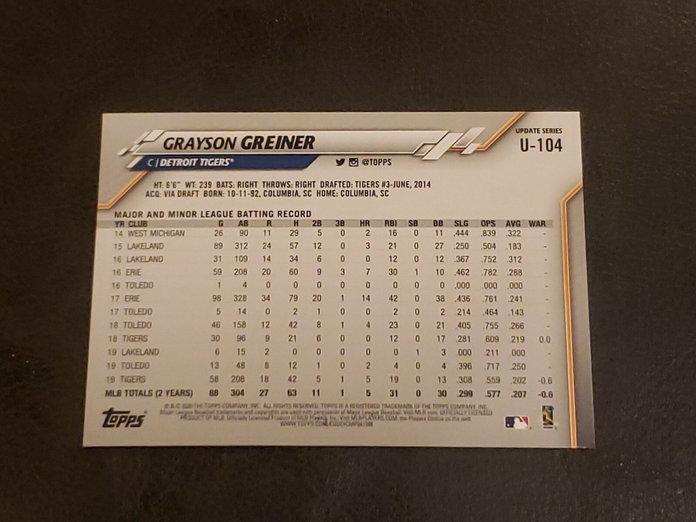 2020 Update Advance Stats Grayson Greiner Detroit Tigers #U-104. Condition is "Very Good". Shipped with USPS First Class.