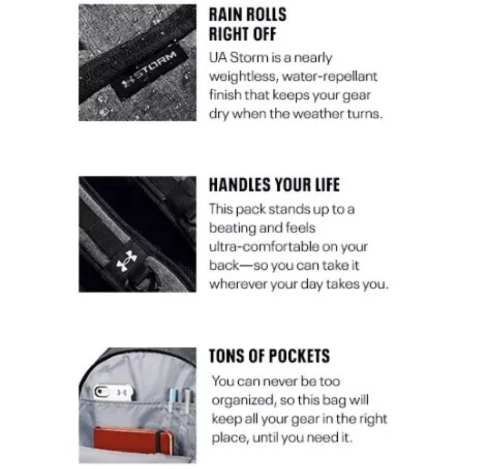 1. This Under Armour backpack is a game-changer! Super sturdy, holds everything I need, and looks sleek in grey. The multiple pockets keep me organized, and the comfy straps make carrying heavy loads easy. Perfect for gym sessions, travel, or campus life—it's stylish and practical. Love the durable material and UA branding. Highly recommend!