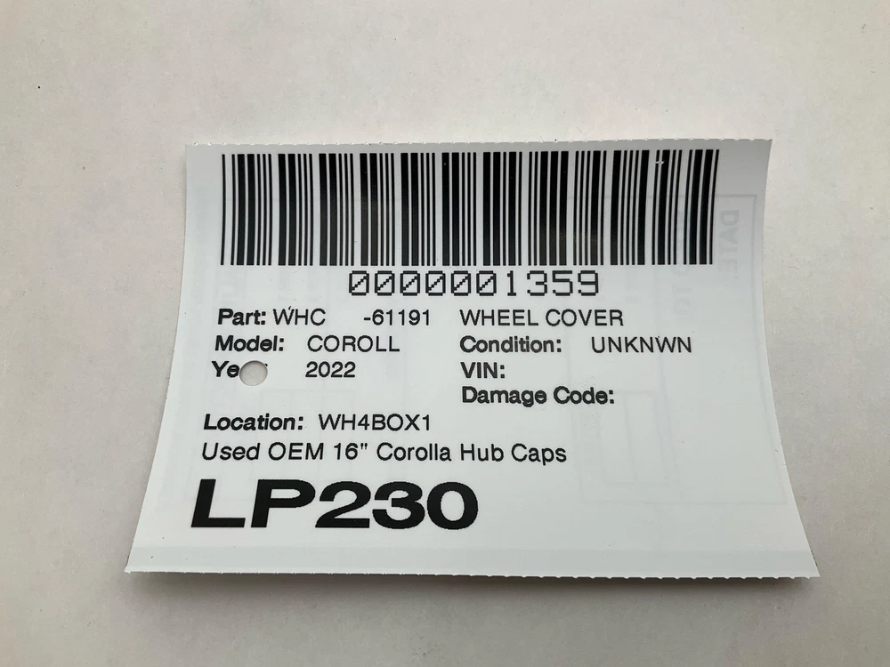 HK Auto Salvage HK Auto Salvage Montebello, CA Business Hours (PST/PDT) Mon - Fri 8am - 5pm Saturday 8am - 2pm Closed Sat & Sun Wheel Cover Year: 22 Model: TOYOTA COROLLA Side: Type: Used Category: Condition: Unknwn VIN: Vehicle Stock #: LP230 Part Stock #: 0000001359 Vehicle Info: Additional notes: Used Oem 16" Corolla Hub Caps In Good Condition See Pictures To Verify Interchange: Sedan, 8 spoke, 16" wheel Also fits: TOYOTA COROLLA (ALSO SEE FX 87-88) 20-22 Sedan, 8 spoke, 16" wheel TOYOTA COROLLA (ALSO SEE FX 87-88) 23-24 (Sedan, 8 spoke) Search for more parts from this donor vehicle Search for more parts for TOYOTA COROLLA Airbag Notification If the item above is an airbag, I certify this airbag is not subject to recall and will be shipped in accordance with hazmat shipping requirements . Payment We accept credit cards through eBay Managed Payments only Sales tax collected by eBay where applicable COD available for orders placed for delivery to local businesses; please contact us prior to purchase to arrange Pay on pickup available for orders placed for local pickup Shipping We ship by FedEx, UPS, and USPS. Most items ship within 24 hours of payment; items paid for on the weekend or holidays ship on the following business day. Any free shipping we offer is for the continental United States only. If you are from Hawaii, Alaska, or a Territory of the United States, please request a shipping total before bidding and we will do our best to keep the cost low. Local delivery and local pickup options are also available. Warranty & Returns 30-day standard warranty on all general parts 90-day standard warranty on engines and transmissions Please verify fitment independently prior to purchase, as the information in the "compatibility" section above is generated by eBay Motors and not from us. If you have questions or concerns about fitment, please contact us prior to purchase. Contact Us If you have any questions regarding an eBay item, please CONTACT US via eBay messaging before you make the purchase. Please verify fitment independently prior to purchase, as the information in the "compatibility" section above is generated by eBay Motors and not from us. If you have questions or concerns about fitment, please contact us prior to purchase. After you have received your product in satisfactory condition, please leave us positive feedback. If there is a problem with your purchase, do not leave neutral or negative feedback: CONTACT US so that we can help you to resolve your issue to your satisfaction. Powered by Checkmate