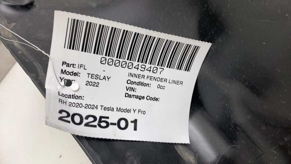 Donut Auto Dismantling Donut Auto Dismantling Rancho Cordova, CA Business Hours (PST/PDT) Mon - Fri 8am - 5pm Closed Sat & Sun Inner Fender Liner Year: 22 Model: TESLA MODEL Y Side: Right Type: Used Category: W Condition: 0cc Vehicle Stock #: 2025-01 Part Stock #: 0000049407 Additional notes: 2020-2024 Tesla Model Y Front Passenger Wheel Fender Liner Splash Guard Right Rh Interchange: Also fits: Search for more parts from this donor vehicle Search for more parts for TESLA MODEL Y Dear Valued Customers Before ordering, please verify the part number and compare the physical details of your part with the photos in our listing. Tesla sometimes changes parts within the same model year, so even if the year matches, variations may exist. Examine all photos and read the description. Please contact us and ask any questions you have about the item. What you see in the pictures is what you will receive. Item are sold as Pictured in our ads, All the damages are marked in pictures with colored markings ........ indicated scratches, O indicate dents/dings view all photos and description. All Parts come with a 30-Day warranty Compatibility We are not responsible for compatibility, please order parts with the same part number to avoid delays and fitment issues in your purchase. Always verify O.E.M part numbers check fitment. Shipping & Return Policy For LTL and freight shipments of large items like Battery Packs, Seats, Doors, Trunks, Hoods, and other sizable body parts, a commercial address is mandatory . This must be a business equipped with a dock or forklift. Please note that deliveries cannot be made to restaurants, office buildings, or hotels. Please allow 5-11 business days from the shipping date to receive freight items. If a forklift is not available to unload your package, please ensure that you added liftgate service fee to your order. Residential deliveries have an extra charge required by LTL to cover liftgate usage and city ordinance. Be advised not all LTL freight companies offer lift gate services in every town especially in rural areas. If you do not have a commercial address or a proper residential address reach out to us to work things out LTL items can always be held at your local hub and made available for pickup. We offer free local pickup Monday through Friday, from 8:00 AM to 5:00 PM. What separates us from our competitors As Pioneers in the Tesla used parts market Donut Auto Parts is leading in the industry. We have been specializing in Tesla's for over 5 years. Our Staff are highly trained and experienced Tesla specialists. We strive to help you solve all your part needs. Local Customers For our local customers we provide installation on battery packs and drive units purchase. Drive unit and battery pack installations come with a 60 day warranty . All parts are fully tested. Using the industries leading tools, we also provide installation of other parts. Please reach out to us directly for more information. Be Advised Programming may be required for most electronic components. Donut Auto Parts is not responsible for any labor costs and other charges such as programming. NO RESTOCKING FEE Payment Payment must be submitted within 48 hours after purchase time. We have a Same handling time when paid by 2pm pst and 3-day handling time for LTL freight items. Feedback and Rating We always Strive to earn positive feedback. If you encounter an issue with one of our items, please contact us before leaving any feedback or opening a case give us the opportunity to solve your order issue. We strive to provide excellent customer service to ensure that everyone is satisfied, and to gain happy and returning customers! ALLOW US TO RESOLVE ISSUES BEFORE LEAVING YOUR FEEDBACK PLEASE CONTACT US FIRST Airbag Notification If the item above is an airbag, I certify this airbag is not subject to recall and will be shipped in accordance with hazmat shipping requirements . Powered by Checkmate