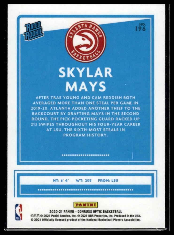 This is a nice example of a 2020-21 Donruss Optic #196 Skylar Mays Other important information about this card: Rated Rookie RC,Chase,Checklist,Parallel,Insert,BASE,SP In 2020 Skylar Mays played for the Atlanta Hawks. Please check out our other listings for more great cards.