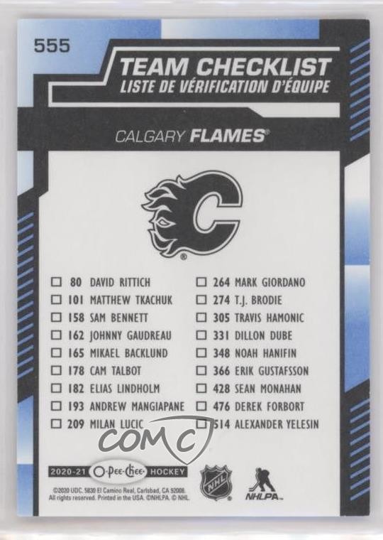 2020-21 O-Pee-Chee - [Base] - Blue Border #555 Team Checklist - Calgary Flames - Ice Hockey Card - Featuring the Calgary Flames - Featuring Calgary Flames Search for more: 2020-21 O-Pee-Chee Search for more: 2020-21 O-Pee-Chee - [Base] - Blue Border View all of our Listings Auctions Buy It Now About Us Located in the beautiful Pacific Northwest, COMC (Check Out My Cards) is the world's largest consignment service for trading card singles. More than 10,000 people have used our consignment service to list over 50 million trading cards. Find out how we can help you consign your items on eBay by contacting us through eBay messaging. COMC -- "The Safe & Easy Way to Buy & Sell" Representative Image - Select Specific Item above to see image of actual item Representative Image - Select Specific Item above to see image of actual item Raw Condition for Modern Cards Unless otherwise noted, raw modern cards are listed in Near Mint-Mint condition or better. A NM-MT card appears to be Mint at first glance, but upon closer inspection, may exhibit some of the following: minor print defects (e.g. roller marks, print line, dimple), minor scratches, slight edge wear, and slight corner wear. Centering is clearly visible in the images provided and does not factor into our condition assessment. Raw Condition for Vintage Cards Unless otherwise noted, raw vintage cards are listed in Excellent condition or better. An EX card may exhibit some of the following: minor rounding of corners, surface wear, print defects, light scratches, and slight edge wear/chipping. Centering is clearly visible in the images provided and does not factor into our condition assessment. Domestic Shipping Combined shipping for multiple items is available. To receive combined shipping, please ensure all desired items are in your eBay shopping cart before proceeding to checkout. eBay limits orders to 40 items per order. We automatically combine multiple orders placed on the same day. If you place multiple orders on the same day, please contact us to request a refund of applicable shipping costs. Signature confirmation may be required on invoices over $400. All cards are protected and shipped securely. International Shipping COMC offers eBay's International Shipping (EIS) for international orders under $2,500* (see country exceptions below). All duties and import fees are paid at checkout; in the rare event that there are additional import fees upon delivery, these are borne by the buyer. EIS packages route through a shipping hub in Erlanger, KY before shipping to their final destination. Please note that EIS does not allow for combined shipments. The shipping rates are determined by eBay and cannot be adjusted. *Maximum sale price exceptions: Colombia, Kuwait ($2,000); Taiwan ($1,539); Chile, Costa Rica, Guatemala, Honduras, Trinidad and Tobago ($1,000); Antigua and Barbuda, Aruba, Belize, Dominica, Grenada, Philippines, Saint Kitts and Nevis, Saint Lucia, Montserrat, Turks and Caicos Islands ($500); Dominican Republic, El Salvador ($200). Please request a shipping quote through eBay messaging for orders that exceed the maximum sale price supported by eBay's International Shipping. You will be responsible for all duties and import fees for international orders shipped outside the EIS. All cards are protected and shipped securely. Payment COMC does not accept offers on our cards through our eBay storefront. COMC utilizes eBay’s managed payments system. If you are experiencing difficulties making a payment, please contact eBay for assistance. Return Policy Returns are only accepted on the rare occasion the item is not as described. If you are making a return, please initiate the return process through eBay so a mailing label can be provided for you. Prior to listing, our expert team carefully assessed this item to represent it accurately. Please review the description and high-definition images prior to purchasing to ensure this item meets your satisfaction. We welcome you to contact us if you have further questions about this item. Trust and Integrity COMC carefully assesses each item consigned to us to prevent fraudulent items from entering the marketplace. If you believe an item offered on COMC may be fraudulent, please contact us with details so we can investigate the issue. Items we determine are outside our supported items policy may be removed. Last Modified: 6/7/2025 7:14:50 AM PDT