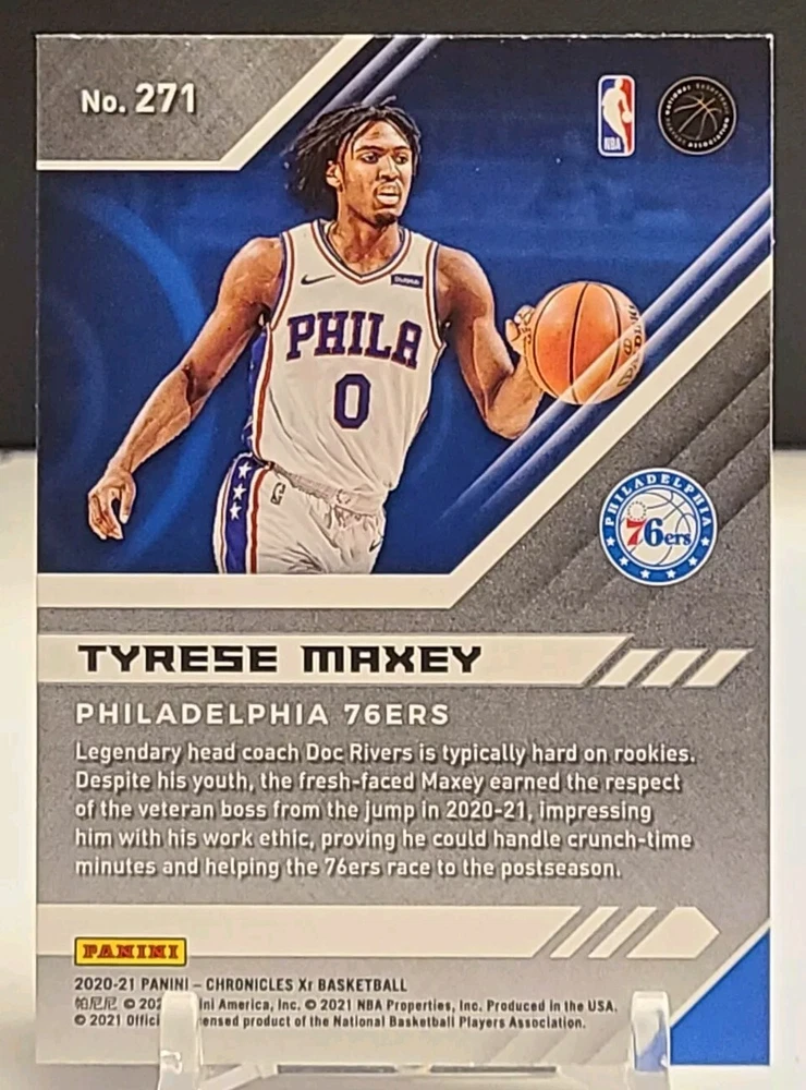 The 2020-21 Panini Chronicles Tyrese Maxey XR #271 RC is a sports trading card featuring rookie basketball player Tyrese Maxey from the Philadelphia 76ers. This card is part of the Panini XR insert set within the larger 2020-21 Panini Chronicles set. The card is made of card stock with a Silver parallel variety, showcasing Maxey in his Philadelphia 76ers uniform. This officially licensed trading card is a collectible item for fans of the National Basketball Association (NBA) and collectors of sports trading cards.