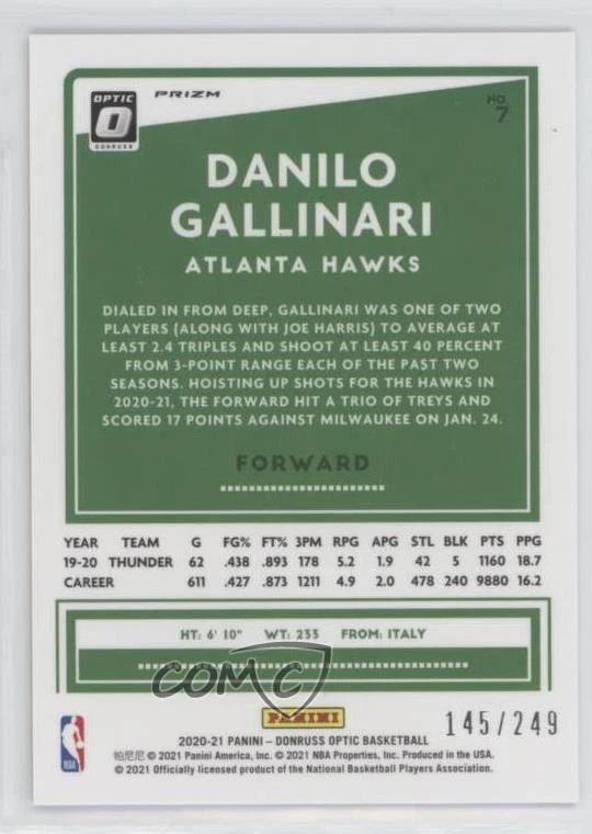 2020-21 Panini Donruss Optic - [Base] - Premium Box Set Prizm #7 Danilo Gallinari Qty Made: 249 - Basketball Card - Featuring the Atlanta Hawks - Featuring Danilo Gallinari Search for more: 2020-21 Panini Donruss Optic Search for more: 2020-21 Panini Donruss Optic - [Base] - Premium Box Set Prizm View all of our Listings Auctions Buy It Now About Us Located in the beautiful Pacific Northwest, COMC (Check Out My Cards) is the world's largest consignment service for trading card singles. More than 10,000 people have used our consignment service to list over 50 million trading cards. Find out how we can help you consign your items on eBay by contacting us through eBay messaging. COMC -- "The Safe & Easy Way to Buy & Sell" Representative Image - Select Specific Item above to see image of actual item Representative Image - Select Specific Item above to see image of actual item Raw Condition for Modern Cards Unless otherwise noted, raw modern cards are listed in Near Mint-Mint condition or better. A NM-MT card appears to be Mint at first glance, but upon closer inspection, may exhibit some of the following: minor print defects (e.g. roller marks, print line, dimple), minor scratches, slight edge wear, and slight corner wear. Centering is clearly visible in the images provided and does not factor into our condition assessment. Raw Condition for Vintage Cards Unless otherwise noted, raw vintage cards are listed in Excellent condition or better. An EX card may exhibit some of the following: minor rounding of corners, surface wear, print defects, light scratches, and slight edge wear/chipping. Centering is clearly visible in the images provided and does not factor into our condition assessment. Domestic Shipping Combined shipping for multiple items is available. To receive combined shipping, please ensure all desired items are in your eBay shopping cart before proceeding to checkout. eBay limits orders to 40 items per order. We automatically combine multiple orders placed on the same day. If you place multiple orders on the same day, please contact us to request a refund of applicable shipping costs. Signature confirmation may be required on invoices over $400. All cards are protected and shipped securely. International Shipping COMC offers eBay's International Shipping (EIS) for international orders under $2,500* (see country exceptions below). All duties and import fees are paid at checkout; in the rare event that there are additional import fees upon delivery, these are borne by the buyer. EIS packages route through a shipping hub in Erlanger, KY before shipping to their final destination. Please note that EIS does not allow for combined shipments. The shipping rates are determined by eBay and cannot be adjusted. *Maximum sale price exceptions: Colombia, Kuwait ($2,000); Taiwan ($1,539); Chile, Costa Rica, Guatemala, Honduras, Trinidad and Tobago ($1,000); Antigua and Barbuda, Aruba, Belize, Dominica, Grenada, Philippines, Saint Kitts and Nevis, Saint Lucia, Montserrat, Turks and Caicos Islands ($500); Dominican Republic, El Salvador ($200). Please request a shipping quote through eBay messaging for orders that exceed the maximum sale price supported by eBay's International Shipping. You will be responsible for all duties and import fees for international orders shipped outside the EIS. All cards are protected and shipped securely. Payment COMC does not accept offers on our cards through our eBay storefront. COMC utilizes eBay’s managed payments system. If you are experiencing difficulties making a payment, please contact eBay for assistance. Return Policy Returns are only accepted on the rare occasion the item is not as described. If you are making a return, please initiate the return process through eBay so a mailing label can be provided for you. Prior to listing, our expert team carefully assessed this item to represent it accurately. Please review the description and high-definition images prior to purchasing to ensure this item meets your satisfaction. We welcome you to contact us if you have further questions about this item. Trust and Integrity COMC carefully assesses each item consigned to us to prevent fraudulent items from entering the marketplace. If you believe an item offered on COMC may be fraudulent, please contact us with details so we can investigate the issue. Items we determine are outside our supported items policy may be removed. Last Modified: 2/7/2025 12:46:42 PM PDT
