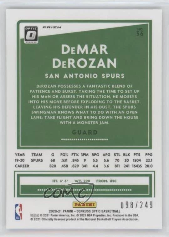 2020-21 Panini Donruss Optic - [Base] - Premium Box Set Prizm #36 DeMar DeRozan Qty Made: 249 - Basketball Card - Featuring the San Antonio Spurs - Featuring DeMar DeRozan Search for more: 2020-21 Panini Donruss Optic Search for more: 2020-21 Panini Donruss Optic - [Base] - Premium Box Set Prizm View all of our Listings Auctions Buy It Now About Us Located in the beautiful Pacific Northwest, COMC (Check Out My Cards) is the world's largest consignment service for trading card singles. More than 10,000 people have used our consignment service to list over 50 million trading cards. We currently house 20 million cards, each listed for sale with front and back images of the actual card. Find out how we can help you consign your items on eBay by contacting us through eBay messaging. COMC -- "The Safe & Easy Way to Buy & Sell" Representative Image - Select Specific Item above to see image of actual item Representative Image - Select Specific Item above to see image of actual item Raw Condition for Modern Cards Unless otherwise noted, raw modern cards are listed in Near Mint-Mint condition or better. A NM-MT card appears to be Mint at first glance, but upon closer inspection, may exhibit some of the following: minor print defects (e.g. roller marks, print line, dimple), minor scratches, slight edge wear, and slight corner wear. Centering is clearly visible in the images provided and does not factor into our condition assessment. Raw Condition for Vintage Cards Unless otherwise noted, raw vintage cards are listed in Excellent condition or better. An EX card may exhibit some of the following: minor rounding of corners, surface wear, print defects, light scratches, and slight edge wear/chipping. Centering is clearly visible in the images provided and does not factor into our condition assessment. Domestic Shipping Combined shipping for multiple items is available. To receive combined shipping, please ensure all desired items are in your eBay shopping cart before proceeding to checkout. eBay limits orders to 40 items per order. We automatically combine multiple orders placed on the same day. If you place multiple orders on the same day, please contact us to request a refund of applicable shipping costs. Signature confirmation may be required on invoices over $400. Raw cards are shipped in toploaders. International Shipping COMC offers eBay's International Shipping (EIS) for international orders under $2,500* (see country exceptions below). All duties and import fees are paid at checkout; in the rare event that there are additional import fees upon delivery, these are borne by the buyer. EIS packages route through a shipping hub in Erlanger, KY before shipping to their final destination. Please note that EIS does not allow for combined shipments. The shipping rates are determined by eBay and cannot be adjusted. *Maximum sale price exceptions: Colombia, Kuwait ($2,000); Taiwan ($1,539); Chile, Costa Rica, Guatemala, Honduras, Trinidad and Tobago ($1,000); Antigua and Barbuda, Aruba, Belize, Dominica, Grenada, Philippines, Saint Kitts and Nevis, Saint Lucia, Montserrat, Turks and Caicos Islands ($500); Dominican Republic, El Salvador ($200). Please request a shipping quote through eBay messaging for orders that exceed the maximum sale price supported by eBay's International Shipping. You will be responsible for all duties and import fees for international orders shipped outside the EIS. Raw cards are shipped in toploaders. Payment COMC does not accept offers on our cards through our eBay storefront. COMC utilizes eBay’s managed payments system. If you are experiencing difficulties making a payment, please contact eBay for assistance. Return Policy Returns are only accepted on the rare occasion the item is not as described. If you are making a return, please initiate the return process through eBay so a mailing label can be provided for you. Prior to listing, our expert team carefully assessed this item to represent it accurately. Please review the description and high-definition images prior to purchasing to ensure this item meets your satisfaction. We welcome you to contact us if you have further questions about this item. Trust and Integrity COMC carefully assesses each item consigned to us to prevent fraudulent items from entering the marketplace. If you believe an item offered on COMC may be fraudulent, please contact us with details so we can investigate the issue. Items we determine are outside our supported items policy may be removed. Last Modified: 1/8/2025 9:11:35 AM PDT