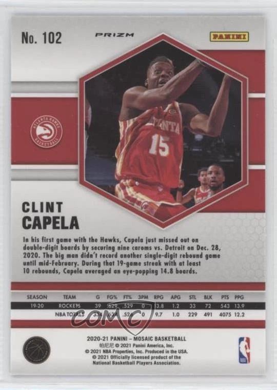 2020-21 Panini Mosaic - [Base] - Mosaic Prizm #102 Clint Capela - Basketball Card - Featuring the Atlanta Hawks - Featuring Clint Capela Search for more: 2020-21 Panini Mosaic Search for more: 2020-21 Panini Mosaic - [Base] - Mosaic Prizm View all of our Listings Auctions Buy It Now About Us Located in the beautiful Pacific Northwest, COMC (Check Out My Cards) is the world's largest consignment service for trading card singles. More than 10,000 people have used our consignment service to list over 50 million trading cards. We currently house 20 million cards, each listed for sale with front and back images of the actual card. Find out how we can help you consign your items on eBay by contacting us through eBay messaging. COMC -- "The Safe & Easy Way to Buy & Sell" Representative Image - Select Specific Item above to see image of actual item Representative Image - Select Specific Item above to see image of actual item Raw Condition for Modern Cards Unless otherwise noted, raw modern cards are listed in Near Mint-Mint condition or better. A NM-MT card appears to be Mint at first glance, but upon closer inspection, may exhibit some of the following: minor print defects (e.g. roller marks, print line, dimple), minor scratches, slight edge wear, and slight corner wear. Centering is clearly visible in the images provided and does not factor into our condition assessment. Raw Condition for Vintage Cards Unless otherwise noted, raw vintage cards are listed in Excellent condition or better. An EX card may exhibit some of the following: minor rounding of corners, surface wear, print defects, light scratches, and slight edge wear/chipping. Centering is clearly visible in the images provided and does not factor into our condition assessment. Domestic Shipping Combined shipping for multiple items is available. To receive combined shipping, please ensure all desired items are in your eBay shopping cart before proceeding to checkout. eBay limits orders to 40 items per order. We automatically combine multiple orders placed on the same day. If you place multiple orders on the same day, please contact us to request a refund of applicable shipping costs. Signature confirmation may be required on invoices over $400. Raw cards are shipped in toploaders. International Shipping COMC offers eBay's International Shipping (EIS) for international orders under $2,500* (see country exceptions below). All duties and import fees are paid at checkout; in the rare event that there are additional import fees upon delivery, these are borne by the buyer. EIS packages route through a shipping hub in Erlanger, KY before shipping to their final destination. Please note that EIS does not allow for combined shipments. The shipping rates are determined by eBay and cannot be adjusted. *Maximum sale price exceptions: Colombia, Kuwait ($2,000); Taiwan ($1,539); Chile, Costa Rica, Guatemala, Honduras, Trinidad and Tobago ($1,000); Antigua and Barbuda, Aruba, Belize, Dominica, Grenada, Philippines, Saint Kitts and Nevis, Saint Lucia, Montserrat, Turks and Caicos Islands ($500); Dominican Republic, El Salvador ($200). Please request a shipping quote through eBay messaging for orders that exceed the maximum sale price supported by eBay's International Shipping. You will be responsible for all duties and import fees for international orders shipped outside the EIS. Raw cards are shipped in toploaders. Payment COMC does not accept offers on our cards through our eBay storefront. COMC utilizes eBay’s managed payments system. If you are experiencing difficulties making a payment, please contact eBay for assistance. Return Policy Returns are only accepted on the rare occasion the item is not as described. If you are making a return, please initiate the return process through eBay so a mailing label can be provided for you. Prior to listing, our expert team carefully assessed this item to represent it accurately. Please review the description and high-definition images prior to purchasing to ensure this item meets your satisfaction. We welcome you to contact us if you have further questions about this item. Trust and Integrity COMC carefully assesses each item consigned to us to prevent fraudulent items from entering the marketplace. If you believe an item offered on COMC may be fraudulent, please contact us with details so we can investigate the issue. Items we determine are outside our supported items policy may be removed. Last Modified: 10/20/2024 5:02:35 AM PDT