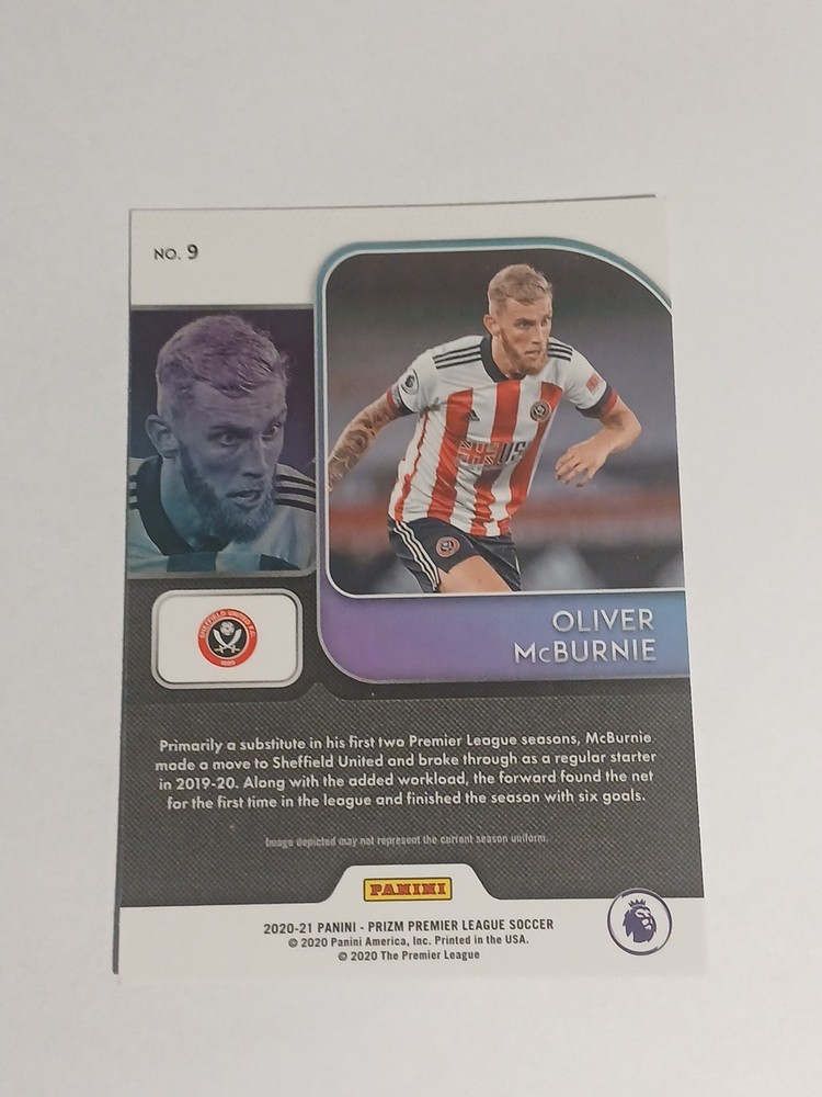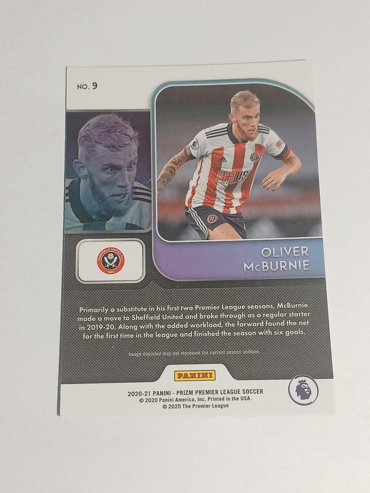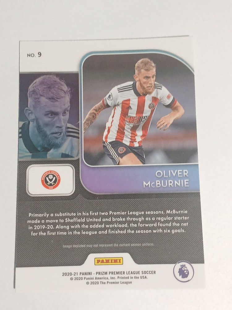 Elevate your collection with the 2020-21 Panini Prizm Premier League #9 Oliver McBurnie Instant Impact card. This trading card features the Sheffield United striker and is a must-have for fans of the sport. The card is from the Instant Impact insert set and showcases McBurnie in his Premier League uniform. The card is in excellent shape and is perfect for collectors of sports memorabilia. The 2020 season was a memorable one for McBurnie and this card captures that moment perfectly. Don't miss out on the chance to add this card to your collection.
