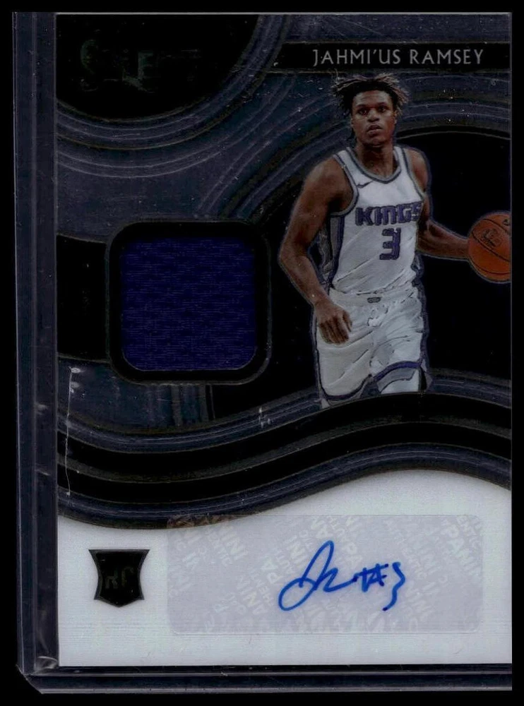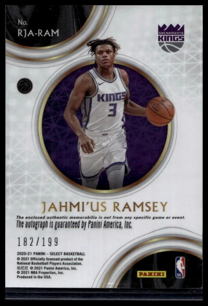 This is a nice example of a 2020-21 Panini Select #RJA-RAM Jahmi'us Ramsey Rookie Jersey Autographs.Other important information about this card: AU,SN,MEMIn 2020 Jahmi'us Ramsey played for the Sacramento Kings.Please check out our other listings for more great cards. Shipping can be combined! First card is $1.25 - each additional card is $0.50. Up to 2 cards will be toploaded, additional cards won/paid for will be in a penny sleeve. Thank you for your business!