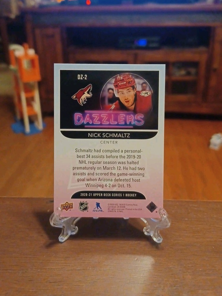 The product is a 2020-21 Upper Deck Dazzlers Nick Schmaltz trading card featuring the Arizona Coyotes. This original sports trading card is part of the Dazzlers insert set, with a Green parallel variety. The card showcases Nick Schmaltz in his National Hockey League (NHL) uniform and is manufactured by Upper Deck in the United States. The card is a standard size and is in English language. This collectible item is a must-have for fans and collectors of ice hockey memorabilia.