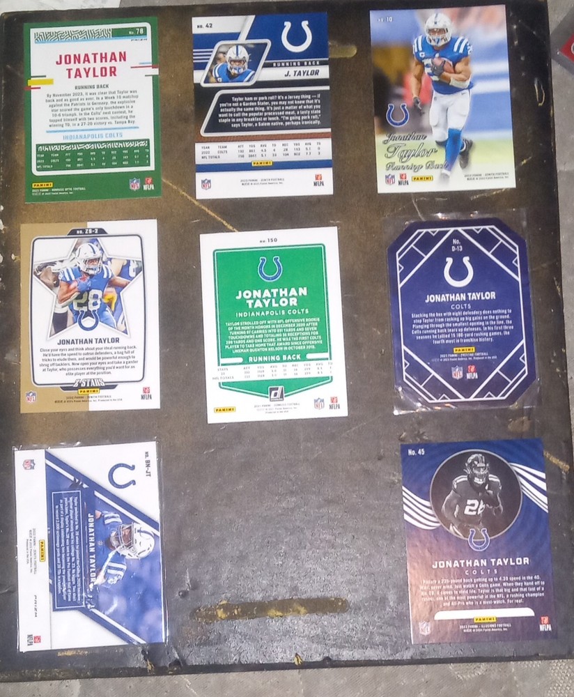 8 card lot of Jonathan Taylor from the Indianapolis Colts. The cards are from various sets including 2022 Panini Zenith, 2021 Donruss, 2023 Panini Illusions, 2023 Donruss Optic, and 2023 Panini Zenith. Sleeved and or toploaded since pulled.Will send more pictures if desired, upon request. Lot inventory is as follows: 2021 Donruss #151 variation 2022 Panini Zenith Behind the Numbers silver prizm # BN-JT 2022 Panini Zenith Z-Stars # ZS-2 holo 2023 Panini Prestige Decorated #D-13 SSP 2023 Donruss Optic silver prizm #78 2023 Panini Zenith Red Zone #42 2023 Panini Zenith 1994 Pacific throwback #10 Blue Mosaic 2023 Panini Illusions #45 Emerald trophy Collection