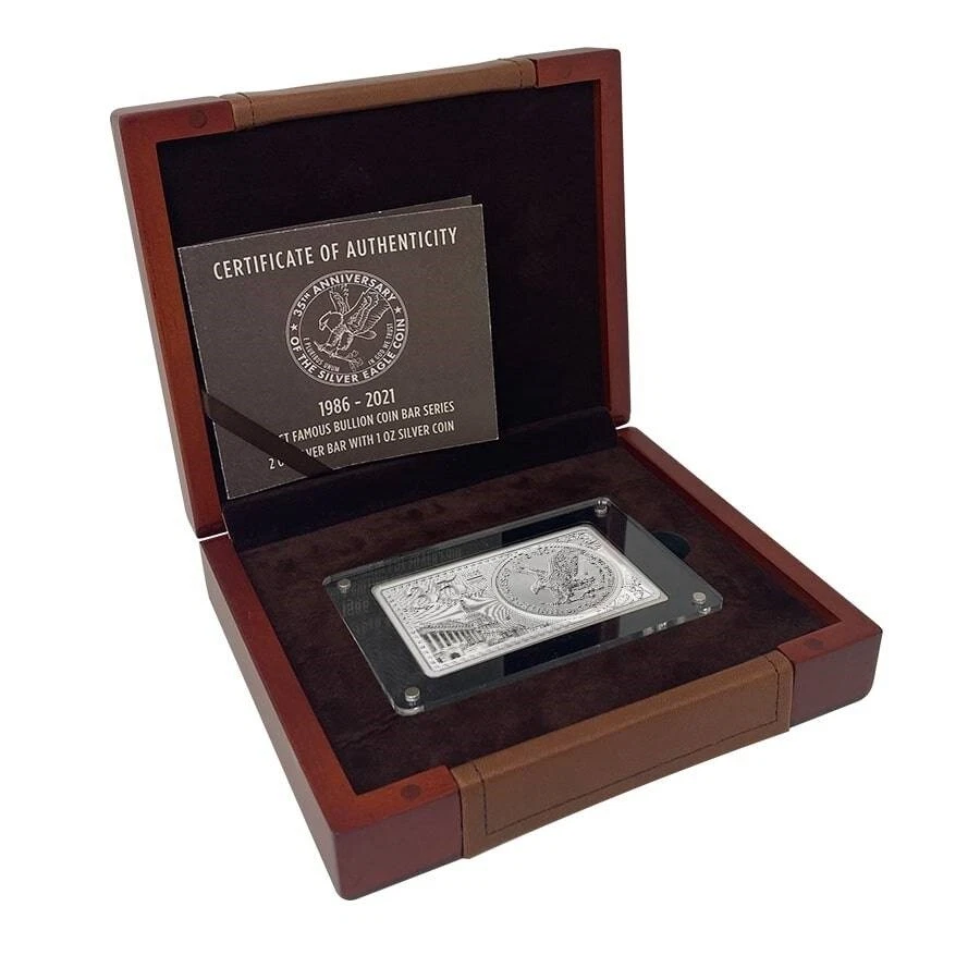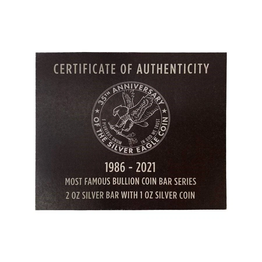 FREE SHIPPING ON DOMESTIC ORDERS New releases Deals Exclusives Bullion Gold Graded Licensed Standing behind our products & our name for over a century SINCE 1915 SHOP BY CATEGORY Animal Theme Art Coins Coin Sets Comics, Notes, & Foils Deals Famous Figures & Landmarks Gold Coins GR Reserve Exclusives Graded Coins Holiday Theme Licensed Products Lunar Calendar Nature Coins Premium Bullion Rare Certificate Numbers Shaped Coins Warriors & Gods Other PARTNERS & AFFILIATIONS STORE NEWSLETTER Add us to your Favorites and receive exclusive emails about new items and special promotions! Sign up 2021 American Silver Eagle 35th Anniversary Coin & Bar 3 oz Silver Set Product Description This bar and coin set contains one bar weighing 2 troy ounces and one coin weighing 1 troy ounce. Additionally, both the bar and coin were struck from .999 fine silver. The Silver Eagle coin, featuring the new reverse design, is housed as a removable insert within the larger silver bar. The designs on the obverse and reverse of the coin blend seamlessly into the surrounding bar’s design, causing the images to appear as one. The Brilliant Uncirculated Silver Coin and Proof Silver Bar display special features that will entice any collector. Hurry though, only 3,500 of these limited-mintage 3 oz Silver Eagle Coin & Bar Sets have been produced. The US Mint has set the bar high with this new 2021 Coin and Bar Set. For the first time ever, anti-counterfeiting technology has been added to a US Silver Eagle, and it was also implemented on the bar as well. These extra security measures include Micro-Text on the product’s surface and radial lines in the bar’s background. Another noteworthy enhancement is the inclusion of individualized serial numbers on each bar. The packaging impresses too — The 3 oz set arrives in a special magnetic holder, inside of a wood-and-leather box. Lastly, the limited mintage of 3,500 pays homage to the 35th Anniversary of the Silver Eagle’s introduction, so they won’t be available for long! The front of the 2 oz bar showcases a majestic bald eagle grasping an olive branch as it flies over a mountain range. The obverse of the Silver Eagle coin features Adolph A Weinman’s “Walking Liberty” design. Lady Liberty walks towards the sunrise while cradling oak and laurel branches in her left arm. The American flag is draped over her shoulders as she stretches her right arm towards the horizon. Inscriptions on the bar include “35th ANNIVERSARY OF THE SILVER EAGLE COIN” and others. Inscriptions on the Eagle Coin include “LIBERTY” and “2021”, among others. The back of the 2 oz bar contains a border of 50 stars around the right side, framing a picturesque side-view of both the US Supreme Court and the US Capitol building. Radial lines emanating from the Silver Eagle coin insert on the left provide a dynamic background for the scene. The right side of the bar features oak branches and the tip of a bald eagle’s wing. The wing on the bar blends into the silver Eagle’s new reverse design, which depicts a Bald Eagle in mid-flight. The eagle grasps an oak branch in its talons as it comes in for a landing. The eagle is surrounded by inscriptions. Contact Shipping Payment Returns To contact our Customer Service Team, simply click the button here and our Customer Service team will be happy to assist. Domestic Shipping Options - Free shipping USPS Ground Advantage UPS Ground Saver International Shipping Options – Calculated USPS Priority Mail International UPS Worldwide Expedited UPS Worldwide Saver UPS Standard to Canada Handling time Will ship within 1 business day of receiving cleared payment. Ship From Location Attleboro, Massachusetts, 02703, United States Note to international buyers The item price and shipping charges do not include import duties, import taxes, and customs clearance fees. These charges are the buyer's responsibility. Please check with your local customs office to determine what these additional charges may be prior to bidding or purchasing an item. If your order is returned to GR Reserve due to your refusal to pay duties or taxes, or if the carrier (for example, Federal Express or UPS) was unable to deliver your order, you agree you are responsible for any return shipping fees, additional duties, or applicable taxes for returning the package back to GR Reserve. In addition, if your package is returned to GR Reserve, we will not reship your order unless and until we are paid in full for any return shipping costs, duties, taxes we have had to pay or advance for you as well as any subsequent re-ship fees back to you. Immediate payment is required upon selecting "Buy It Now" or upon checking out through the cart. We accept payment via U.S. PayPal accounts and all Major Credit Cards, Debit Cards & Google Pay. We are legally required to collect sales tax in those states and localities where we maintain a physical presence. The applicable amount of sales tax charged to an order will be calculated based on the shipment destination's state and local sales tax laws. Thank you for shopping with us on eBay! Standard Other eBay Mastercard® Earn up to 5x points when you use your eBay Mastercard®. Learn more GR Reserve’s return, refund, and exchange policy is limited to (30) business days from the date that you received your item. If you find you have received a defective item, please contact us, and include detailed photos. GR Reserve will then assess whether the product is eligible for a return, refund, or exchange. For approved exchanges, you must follow all instructions provided by us, including packaging the product appropriately. We are responsible for the cost of return domestic shipping and the risk of loss during the return shipment. Refer to eBay Return policy for more details. You are covered by the eBay Money Back Guarantee if you receive an item that is not as described in the listing. Free Shipping On all domestic order 100% SATISFACTION GUARANTEED About Fee