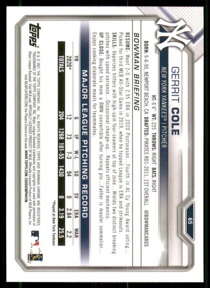 2021 Bowman #65 Gerrit Cole Front Back Sport: Baseball Set: 2021 Bowman Year: 2021 Item#: 65 Player: Gerrit Cole Team: New York Yankees Brand: Bowman Manufacturer: Topps Co. Grading Company: Raw Grade SetType: Main Item Condition: Near Mint/Mint 2014 Beckett Collectibles, LLC. All Rights Reserved Powered by: Thank you for choosing Burbank Sportscards, the sports cards superstore. We offer a large selection of singles across all sports. Visit our ebay store to view all our items available. Our Shipping Policy We offer Free Standard Shipping to all Domestic customers. Options for Expedited shipping are also available at checkout. For our international customers, shipping is $9.99 for the first item, and $0.25 for each additional item. Note to all customers: To qualify for combines shipping, we ask our customers to add items into the shopping cart. Please note, we do not combine orders that are placed separately. Our Service: Generally, our turnaround is super quick as we process and send out orders same day payment is received. Stock Availability: We do our best to ensure all items are in stock; however, in case of the rare stock out, the customer will have the option for a replacement card, or we will process a refund so the order is not held up. Our Images: Many of our images are stock photos from Beckett archives. They are a representation of the actual card you would receive. If you have any questions regarding the item you're interested in, please feel free to ask (serial numbers and relic pieces may vary) Moreover, in a case of a wrong or defective photo, please notify us, so we can adjust it. Other FAQ's: -When buying multiple cards, do you top load each item? No; however, we do try to insure all items are shipped securely. If you wish to have all of your cards top loaded it is a paid service and can be arranged. Please email for more details. For other questions, please feel free to ask. Thank you.
