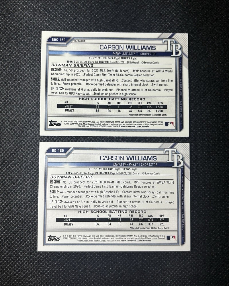 The product is a lot of two 2021 Bowman Carson Williams baseball trading cards. These cards feature a Chrome Refractor and a Sky Blue Parallel, limited to only 499 copies. The cards are standard in size and are part of the Major League Baseball league. They are original prints manufactured by Bowman in the United States, showcasing the rookie player Carson Williams from the Tampa Bay Rays. The cards are made of paper and are in English language, making them a sought-after collectible for baseball fans and trading card enthusiasts.