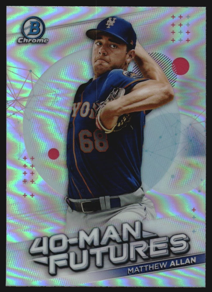 2021 Bowman Chrome 40-Man Futures Refractors #FMF30 Matthew Allan Front Back Sport: Baseball Set: 2021 Bowman Chrome 40-Man Futures Refractors Year: 2021 Item#: FMF30 Player: Matthew Allan Team: New York Mets Brand: Bowman Chrome Manufacturer: Topps Co. Grading Company: Raw Grade SetType: Insert Item Condition: Near Mint/Mint 2014 Beckett Collectibles, LLC. All Rights Reserved Powered by: Thank you for choosing Burbank Sportscards, the sports cards superstore. We offer a large selection of singles across all sports. Visit our ebay store to view all our items available. Our Shipping Policy We offer Free Standard Shipping to all Domestic customers. Options for Expedited shipping are also available at checkout. For our international customers, shipping is $9.99 for the first item, and $0.25 for each additional item. Note to all customers: To qualify for combines shipping, we ask our customers to add items into the shopping cart. Please note, we do not combine orders that are placed separately. Our Service: Generally, our turnaround is super quick as we process and send out orders same day payment is received. Stock Availability: We do our best to ensure all items are in stock; however, in case of the rare stock out, the customer will have the option for a replacement card, or we will process a refund so the order is not held up. Our Images: Many of our images are stock photos from Beckett archives. They are a representation of the actual card you would receive. If you have any questions regarding the item you're interested in, please feel free to ask (serial numbers and relic pieces may vary) Moreover, in a case of a wrong or defective photo, please notify us, so we can adjust it. Other FAQ's: -When buying multiple cards, do you top load each item? No; however, we do try to insure all items are shipped securely. If you wish to have all of your cards top loaded it is a paid service and can be arranged. Please email for more details. For other questions, please feel free to ask. Thank you.