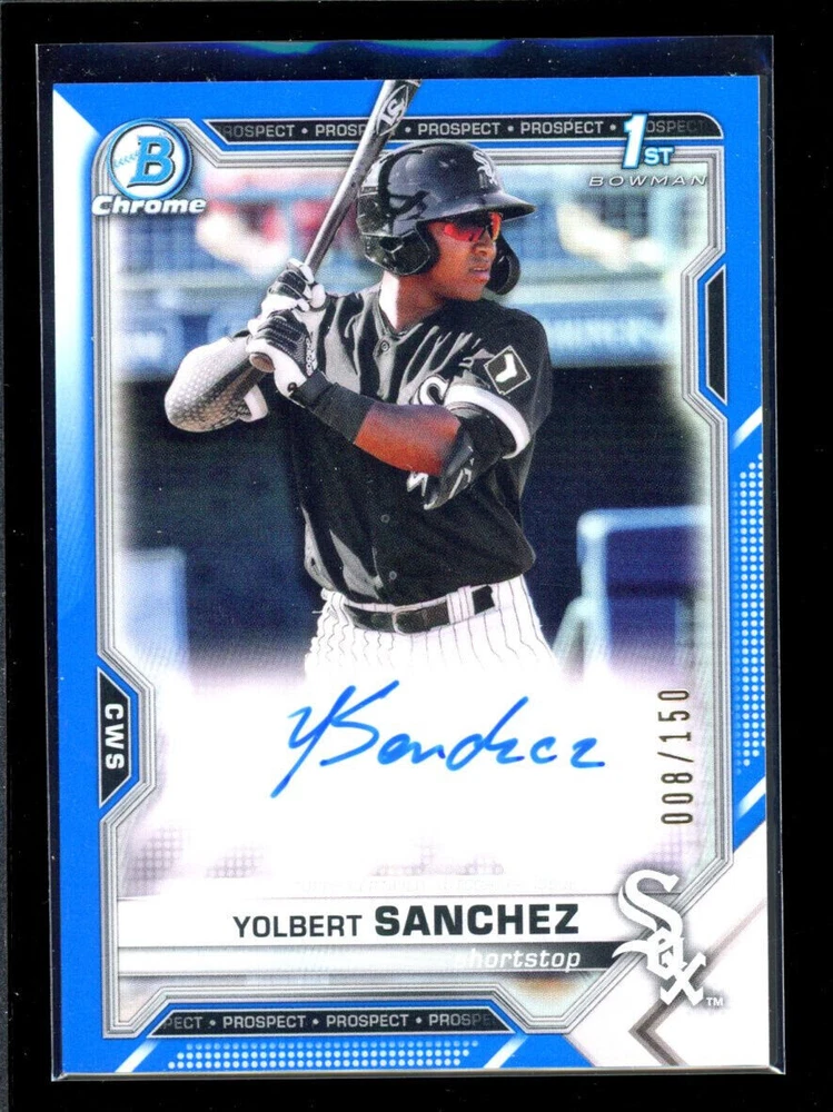 2021 Bowman Chrome Prospect Autographs Blue Refractors #CPAYSA Yolbert Sanchez 008/150 WE Combined shipping We have 2 ways of shipping: first way WE SHIP ALL CARDS IN PADDED ENVELOPES COMBINED SHIPPING WITHIN 5 DAYS FOR CARD PRICES: 1 - $4.50 2-10 $6.00 11-25 $9.99 26+ MESSAGE FOR PRICING Second and cheapest way Shipped in a soft sleeve and toploader in a team bag via ebay standard White envelope