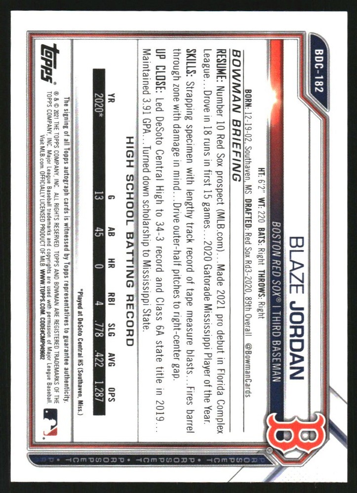 2021 Bowman Chrome Draft Image Variation Autographs #BDC182 Blaze Jordan/99 Front Back Sport: Baseball Set: 2021 Bowman Chrome Draft Image Variation Autographs Year: 2021 Item#: BDC182 Player: Blaze Jordan Team: Boston Red Sox Attributes: Autograph, Serial Numbered Brand: Bowman Draft Manufacturer: Topps Co. Grading Company: Raw Grade SetType: Insert Item Condition: Near Mint/Mint 2014 Beckett Collectibles, LLC. All Rights Reserved Powered by: Thank you for choosing Burbank Sportscards, the sports cards superstore. We offer a large selection of singles across all sports. Visit our ebay store to view all our items available. Our Shipping Policy We offer Free Standard Shipping to all Domestic customers. Options for Expedited shipping are also available at checkout. For our international customers, shipping is $9.99 for the first item, and $0.25 for each additional item. Note to all customers: To qualify for combines shipping, we ask our customers to add items into the shopping cart. Please note, we do not combine orders that are placed separately. Our Service: Generally, our turnaround is super quick as we process and send out orders same day payment is received. Stock Availability: We do our best to ensure all items are in stock; however, in case of the rare stock out, the customer will have the option for a replacement card, or we will process a refund so the order is not held up. Our Images: Many of our images are stock photos from Beckett archives. They are a representation of the actual card you would receive. If you have any questions regarding the item you're interested in, please feel free to ask (serial numbers and relic pieces may vary) Moreover, in a case of a wrong or defective photo, please notify us, so we can adjust it. Other FAQ's: -When buying multiple cards, do you top load each item? No; however, we do try to insure all items are shipped securely. If you wish to have all of your cards top loaded it is a paid service and can be arranged. Please email for more details. For other questions, please feel free to ask. Thank you.