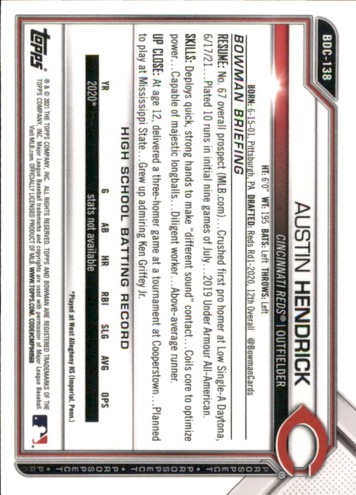 2021 Bowman Chrome Draft Cincinnati Reds Baseball Card #BDC138 Austin Hendrick Front Back Sport: Baseball Set: 2021 Bowman Chrome Draft Year: 2021 Item#: BDC138 Player: Austin Hendrick Team: Cincinnati Reds Brand: Bowman Draft Manufacturer: Topps Co. Grading Company: Raw Grade SetType: Main Item Condition: Near Mint/Mint 2014 Beckett Collectibles, LLC. All Rights Reserved Powered by: Thank you for choosing Burbank Sportscards, the sports cards superstore. We offer a large selection of singles across all sports. Visit our ebay store to view all our items available. Our Shipping Policy We offer Free Standard Shipping to all Domestic customers. Options for Expedited shipping are also available at checkout. For our international customers, shipping is $9.99 for the first item, and $0.25 for each additional item. Note to all customers: To qualify for combines shipping, we ask our customers to add items into the shopping cart. Please note, we do not combine orders that are placed separately. Our Service: Generally, our turnaround is super quick as we process and send out orders same day payment is received. Stock Availability: We do our best to ensure all items are in stock; however, in case of the rare stock out, the customer will have the option for a replacement card, or we will process a refund so the order is not held up. Our Images: Many of our images are stock photos from Beckett archives. They are a representation of the actual card you would receive. If you have any questions regarding the item you're interested in, please feel free to ask (serial numbers and relic pieces may vary) Moreover, in a case of a wrong or defective photo, please notify us, so we can adjust it. Other FAQ's: -When buying multiple cards, do you top load each item? No; however, we do try to insure all items are shipped securely. If you wish to have all of your cards top loaded it is a paid service and can be arranged. Please email for more details. For other questions, please feel free to ask. Thank you.